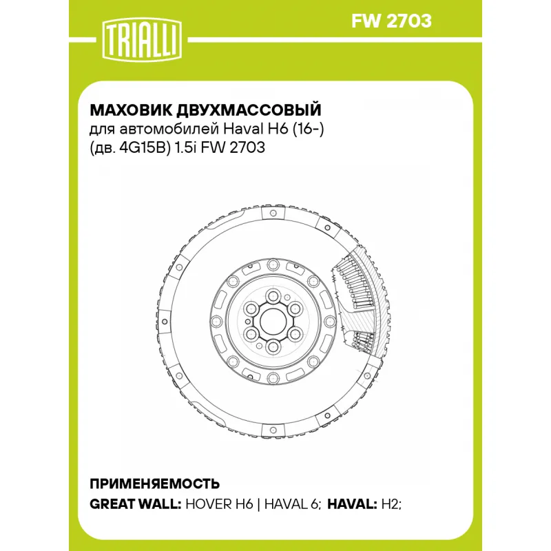 Маховик двухмассовый для автомобилей Haval H6 (16-) (дв. 4G15B) 1.5i Характеристики: Артикул: FW 2703 OEM номера: 1005200-EG01B Особенности конструкции:: Двухмассовый Гарантийный срок: 2 года/60 000 км Товарная линейка: BLACK Количество на автомобиль: 1 Двигатель: 4G15B Комплектация: Маховик - 1 шт Гарантия: от 1 года.
