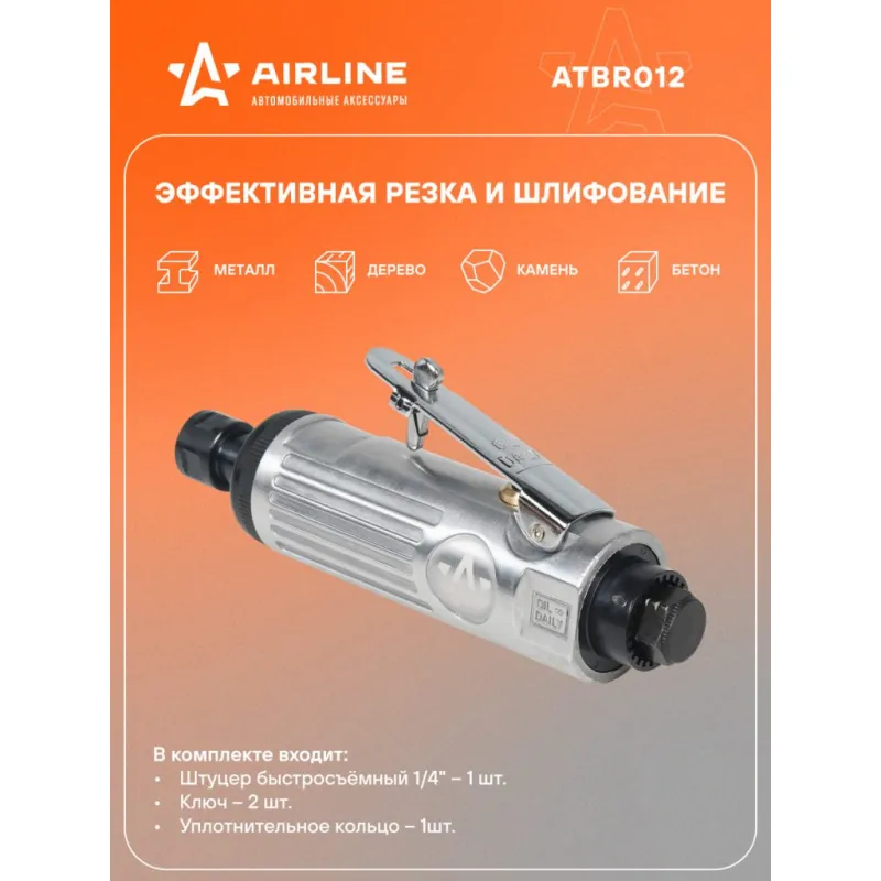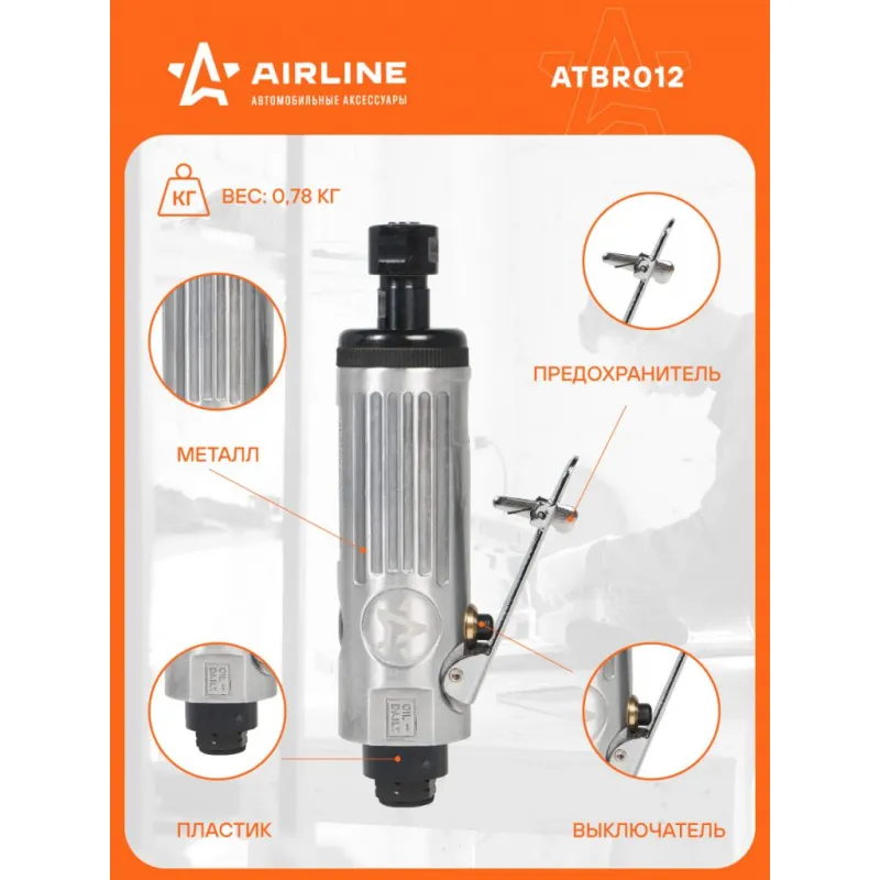 Машинка шлифовальная пневматическая 175мм, 22000 об/мин прямая Описание: Шлифовальная прямая пневматическая машинка AIRLINE ATBR012 предназначена для шлифовки различных поверхностей изделий и частей, а также резки и полировки с помощью разнообразной оснастки зажимаемой в цанговый патрон. Корпус инструмента выполнен из металла, что обеспечивает ему отличную устойчивость к механическим повреждениям. Ручной пневмоинструмент применяется для работ с борфрезами и шлифовальными головками по металлу, пластику и другим материалам. При работе с инструментом необходимо использовать защитные очки, наушники и защитные перчатки. Вибрационные параметры инструмента соответствуют требованиям ГОСТ 17770-86. Шумовые характеристики инструмента соответствуют требованиям ГОСТ 12.2.030-83. Рекомендуется хранить аппарат в сухом, хорошо проветриваемом помещении и не подвергать его воздействию повышенной влажности, коррозионно-опасных газов и пыли. В комплектации вы найдете инструкцию, рекомендуем ознакомиться до начала эксплуатации инструмента. Характеристики: Артикул: ATBR012 Вес, кг: 0.69 Диаметр присоединительного штуцера: 1/4" Частота вращения вала, об/мин: 22000 Рабочее давление воздуха, АТМ: 6.3 Диаметр цанги, мм: 3, 6 Комплектация: Машинка шлифовальная - 1 шт Цанга (3мм, 6мм) - 2 шт Штуцер быстросъёмный 1/4" - 1 шт Ключ - 2 шт Паспорт - 1 шт Уплотнительное кольцо - 1 шт Гарантия: от 1 года.