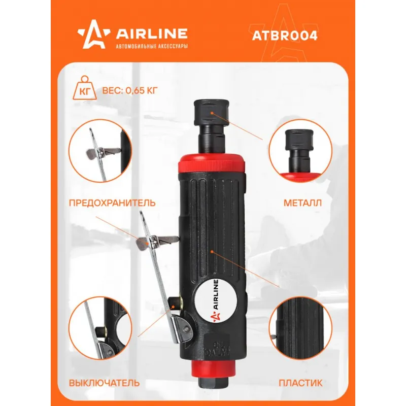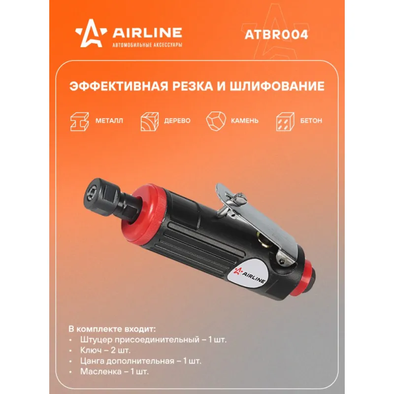 Машинка шлифовальная пневматическая 175мм, 25000 об/мин прямая Описание: Шлифовальная прямая пневматическая машинка AIRLINE ATBR004 предназначена для шлифовки различных поверхностей изделий и частей, а также резки и полировки с помощью разнообразной оснастки зажимаемой в цанговый патрон. Корпус инструмента выполнен из металла, что обеспечивает ему отличную устойчивость к механическим повреждениям. Ручной пневмоинструмент применяется для работ с борфрезами и шлифовальными головками по металлу, пластику и другим материалам. При работе с инструментом необходимо использовать защитные очки, наушники и защитные перчатки. Вибрационные параметры инструмента соответствуют требованиям ГОСТ 17770-86. Шумовые характеристики инструмента соответствуют требованиям ГОСТ 12.2.030-83. Рекомендуется хранить аппарат в сухом, хорошо проветриваемом помещении и не подвергать его воздействию повышенной влажности, коррозионно-опасных газов и пыли. В комплектации вы найдете инструкцию, рекомендуем ознакомиться до начала эксплуатации инструмента. Характеристики: Артикул: ATBR004 OEM номера: AAG0510, JAS-6552 Вес, кг: 0.66 Диаметр присоединительного штуцера: 1/4" Частота вращения вала, об/мин: 25000 Рабочее давление воздуха, АТМ: 6.3 Расход воздуха, л/мин: 140 Диаметр цанги, мм: 3, 6 Комплектация: Машинка шлифовальная - 1 шт Штуцер присоединительный - 1 шт Инструкция - 1 шт Маслёнка - 1 шт Ключ - 2 шт Цанга (3мм, 6мм) - 2 шт Гарантия: от 1 года.