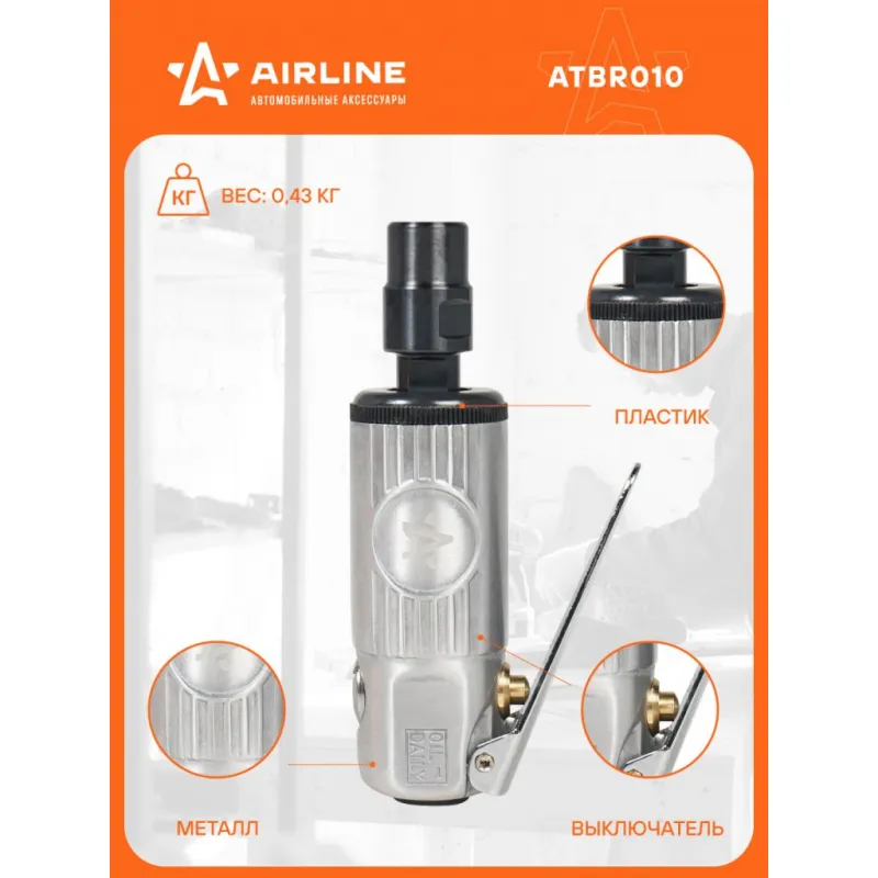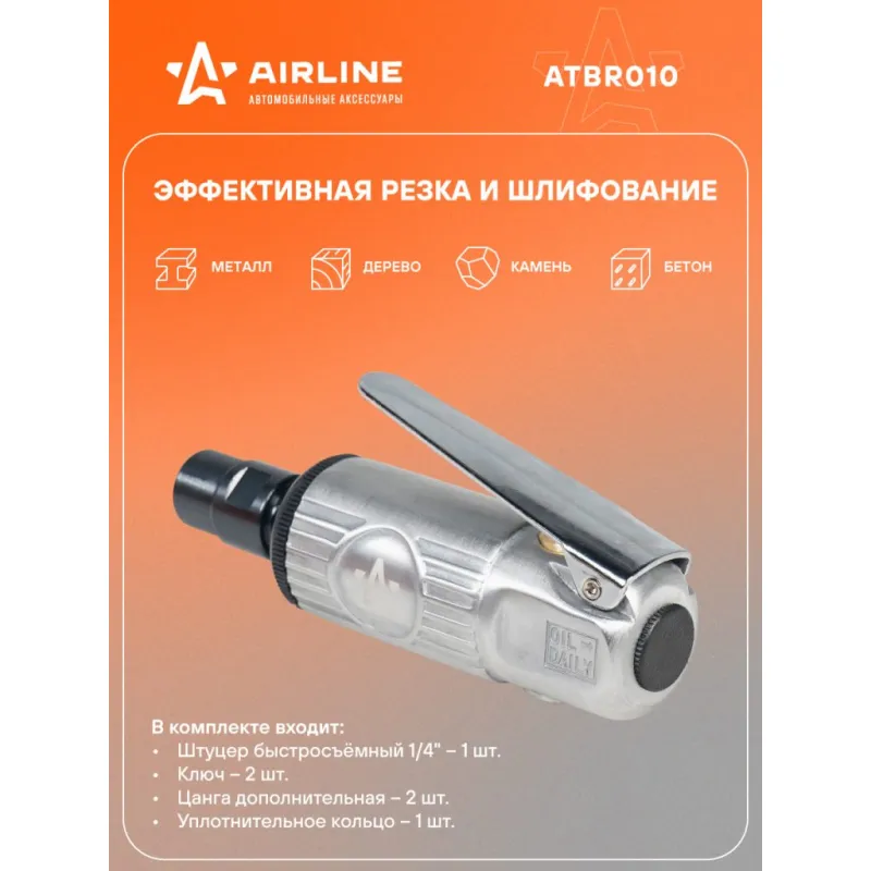 Машинка шлифовальная пневматическая 120мм ШМ2, 25000 об/мин прямая Описание: Шлифовальная прямая пневматическая машинка AIRLINE МИНИ ATBR010 предназначена для шлифовки различных поверхностей изделий и частей, а также резки и полировки с помощью разнообразной оснастки зажимаемой в цанговый патрон. Корпус инструмента выполнен из металла, что обеспечивает ему отличную устойчивость к механическим повреждениям. Ручной пневмоинструмент применяется для работ с борфрезами и шлифовальными головками по металлу, пластику и другим материалам. При работе с инструментом необходимо использовать защитные очки, наушники и защитные перчатки. Вибрационные параметры инструмента соответствуют требованиям ГОСТ 17770-86. Шумовые характеристики инструмента соответствуют требованиям ГОСТ 12.2.030-83. Рекомендуется хранить аппарат в сухом, хорошо проветриваемом помещении и не подвергать его воздействию повышенной влажности, коррозионно-опасных газов и пыли. В комплектации вы найдете инструкцию, рекомендуем ознакомиться до начала эксплуатации инструмента. Характеристики: Артикул: ATBR010 Вес, кг: 0.37 Диаметр присоединительного штуцера: 1/4" Частота вращения вала, об/мин: 25000 Рабочее давление воздуха, АТМ: 6.3 Диаметр цанги, мм: 3, 6 Комплектация: Машинка шлифовальная - 1 шт Цанга (3мм, 6мм) - 2 шт Штуцер быстросъёмный 1/4" - 1 шт Ключ - 2 шт Паспорт - 1 шт Уплотнительное кольцо - 1 шт Гарантия: от 1 года.