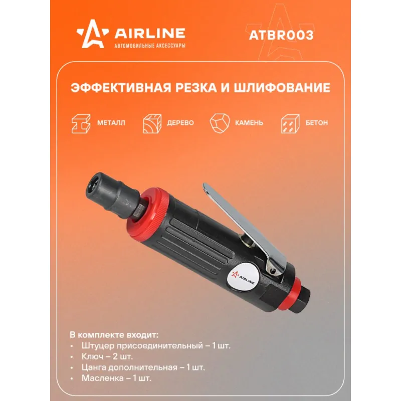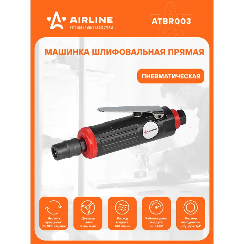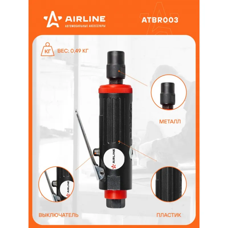 Машинка шлифовальная пневматическая 120мм ШМ1, 25000 об/мин прямая Описание: Шлифовальная прямая пневматическая машинка AIRLINE МИНИ ATBR003 предназначена для шлифовки различных поверхностей изделий и частей, а также резки и полировки с помощью разнообразной оснастки зажимаемой в цанговый патрон. Корпус инструмента выполнен из металла, что обеспечивает ему отличную устойчивость к механическим повреждениям. Ручной пневмоинструмент применяется для работ с борфрезами и шлифовальными головками по металлу, пластику и другим материалам. При работе с инструментом необходимо использовать защитные очки, наушники и защитные перчатки. Вибрационные параметры инструмента соответствуют требованиям ГОСТ 17770-86. Шумовые характеристики инструмента соответствуют требованиям ГОСТ 12.2.030-83. Рекомендуется хранить аппарат в сухом, хорошо проветриваемом помещении и не подвергать его воздействию повышенной влажности, коррозионно-опасных газов и пыли. В комплектации вы найдете инструкцию, рекомендуем ознакомиться до начала эксплуатации инструмента. Характеристики: Артикул: ATBR003 OEM номера: AOS6105 Вес, кг: 0.4 Диаметр присоединительного штуцера: 1/4" Частота вращения вала, об/мин: 25000 Рабочее давление воздуха, АТМ: 6.3 Расход воздуха, л/мин: 140 Диаметр цанги, мм: 3, 6 Комплектация: Машинка шлифовальная - 1 шт Штуцер присоединительный - 1 шт Инструкция - 1 шт Маслёнка - 1 шт Ключ - 2 шт Цанга (3мм, 6мм) - 2 шт Гарантия: от 1 года.