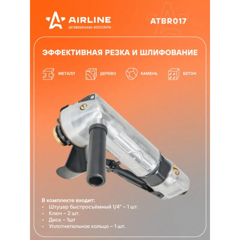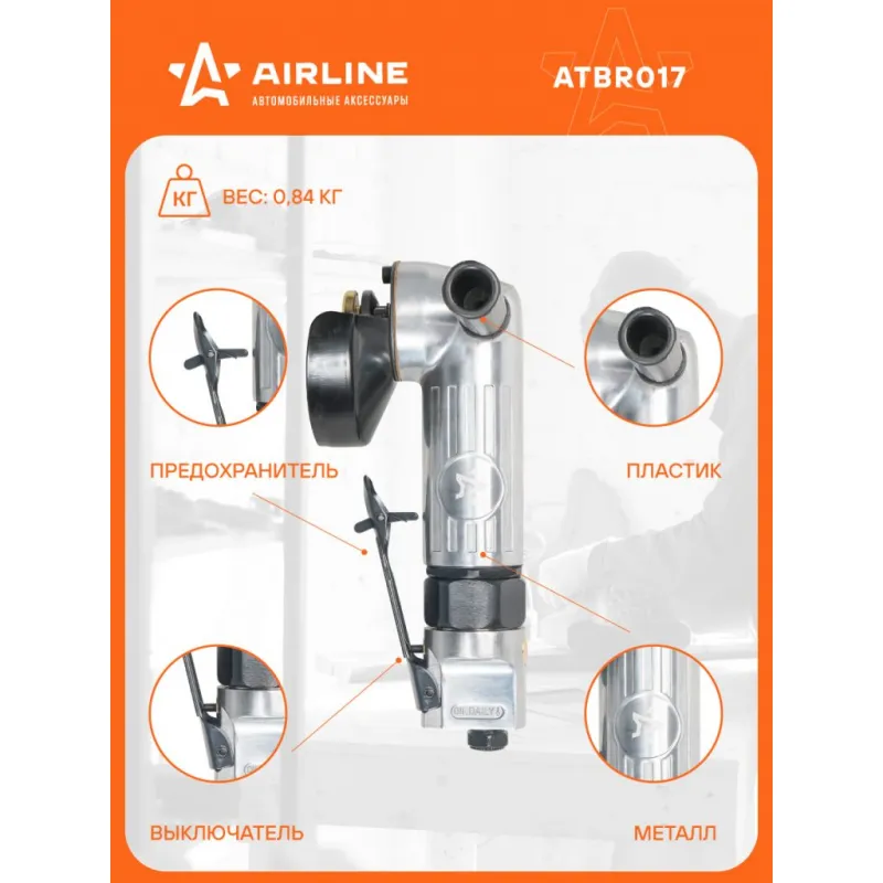Машинка шлифовальная пневматическая угловая 228мм, 10000 об/мин дисковая Описание: Шлифовальная угловая пневматическая машинка AIRLINE ATBR017 предназначена для шлифовки различных поверхностей изделий и частей, а также резки и полировки с помощью разнообразной оснастки зажимаемой в цанговый патрон. Корпус инструмента выполнен из металла, что обеспечивает ему отличную устойчивость к механическим повреждениям. Ручной пневмоинструмент применяется для работ с борфрезами и шлифовальными головками по металлу, пластику и другим материалам. При работе с инструментом необходимо использовать защитные очки, наушники и защитные перчатки. Вибрационные параметры инструмента соответствуют требованиям ГОСТ 17770-86. Шумовые характеристики инструмента соответствуют требованиям ГОСТ 12.2.030-83. Рекомендуется хранить аппарат в сухом, хорошо проветриваемом помещении и не подвергать его воздействию повышенной влажности, коррозионно-опасных газов и пыли. В комплектации вы найдете инструкцию, рекомендуем ознакомиться до начала эксплуатации инструмента. Характеристики: Артикул: ATBR017 Вес, кг: 1.76 Диаметр присоединительного штуцера: 1/4" Частота вращения вала, об/мин: 10000 Рабочее давление воздуха, АТМ: 6.3 Посадочный диаметр диска, мм: 16 Размер диска, мм: 100, 125 Комплектация: Машинка шлифовальная - 1 шт Диск - 1 шт Штуцер быстросъёмный 1/4" - 1 шт Ключ - 2 шт Паспорт - 1 шт Уплотнительное кольцо - 1 шт Гарантия: от 1 года.