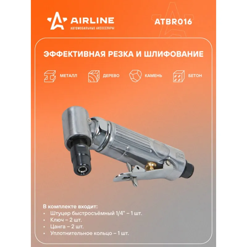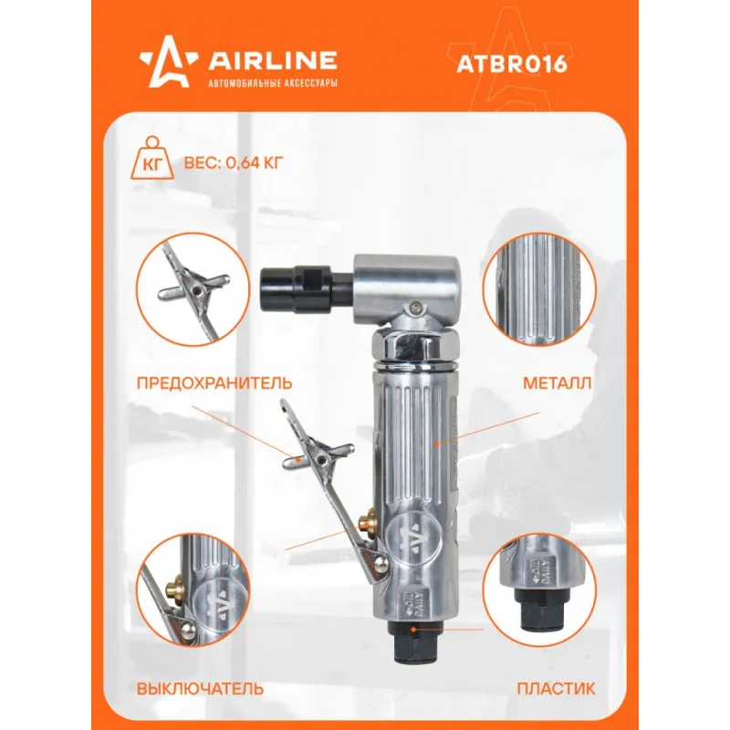 Машинка шлифовальная пневматическая угловая 205мм, 20000 об/мин Описание: Шлифовальная угловая пневматическая машинка AIRLINE ATBR016 предназначена для шлифовки различных поверхностей изделий и частей, а также резки и полировки с помощью разнообразной оснастки зажимаемой в цанговый патрон. Корпус инструмента выполнен из металла, что обеспечивает ему отличную устойчивость к механическим повреждениям. Ручной пневмоинструмент применяется для работ с борфрезами и шлифовальными головками по металлу, пластику и другим материалам. При работе с инструментом необходимо использовать защитные очки, наушники и защитные перчатки. Вибрационные параметры инструмента соответствуют требованиям ГОСТ 17770-86. Шумовые характеристики инструмента соответствуют требованиям ГОСТ 12.2.030-83. Рекомендуется хранить аппарат в сухом, хорошо проветриваемом помещении и не подвергать его воздействию повышенной влажности, коррозионно-опасных газов и пыли. В комплектации вы найдете инструкцию, рекомендуем ознакомиться до начала эксплуатации инструмента. Характеристики: Артикул: ATBR016 Вес, кг: 0.56 Диаметр присоединительного штуцера: 1/4" Частота вращения вала, об/мин: 20000 Рабочее давление воздуха, АТМ: 6.3 Комплектация: Машинка шлифовальная - 1 шт Цанга (3мм, 6мм) - 2 шт Штуцер быстросъёмный 1/4" - 1 шт Ключ - 2 шт Паспорт - 1 шт Уплотнительное кольцо - 1 шт Гарантия: от 1 года.