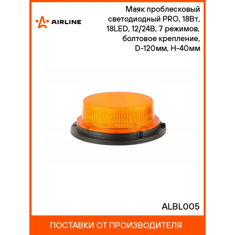 Маяк проблесковый светодиодный PRO, 18Вт, 18LED, 12/24В, 7 режимов, болтовое крепление, D-120мм, H-40мм Описание: Светодиодный проблесковый маяк AIRLINE ALBL005 предназначен для световой сигнализации на транспортных средствах коммерческого, строительного, сельскохозяйственного и специального назначения. Устройство оснащено 18 светодиодами общей мощностью 18 Вт и поддерживает 7 режимов работы: 1. Одиночная вспышка (ECE R65); 2. Одиночная вспышка замедленная; 3. Одиночная вспышка с плавным нарастанием и затуханием яркости; 4. Двойная вспышка (ECE R65); 5. Четырехкратная вспышка (ECE R65); 6. Восьмикратная вспышка; 7. Вращение. Яркий световой сигнал различим при любых погодных условиях и в любое время суток, обеспечивая устойчивую визуальную идентификацию транспортного средства в дорожных и производственных условиях. Корпус маяка устойчив к механическим и атмосферным воздействиям, выполнен согласно классу защиты IP67: конструкция полностью герметична, исключает проникновение пыли и влаги. Соответствие европейскому стандарту ECE R65 подтверждает надёжность и эффективность световой сигнализации. Установка осуществляется с помощью трёх болтов М5. Крепёжные элементы входят в комплект поставки. Подключение выполняется через три провода (+/–/–). Автосвет AIRLINE – надёжное освещение для уверенной поездки в любых условиях. Характеристики: Артикул: ALBL005 Номинальная мощность, Вт: 18 Количество светодиодов, шт: 18 Факт. потребляемый ток при 12В, А: 0.76 Факт. потребляемый ток при 24В, А: 0.4 Количество режимов работы: 7 Соответствие стандарту ECE R65: Да Тип крепления: Болтовое (3 болта M5) Тип кабеля: Три провода (+/?/–) Полярность: Красный провод – «+», черный провод – «–», желтый провод – «–» Длина кабеля, см: 30 Высота устройства, мм: 40 Диаметр устройства, мм: 120 Комплектация: Маяк проблесковый светодиодный - 1 шт Винт с полукруглой головкой и крестообразным шлицем - 3 шт Шайба M5 - 3 шт Шайба пружинная M5 - 3 шт Гайка шестигранная M5 - 3 шт Руководство по эксплуатации - 1 шт Гарантийный талон - 1 шт Упаковочная коробка - 1 шт Гарантия: от 1 года.