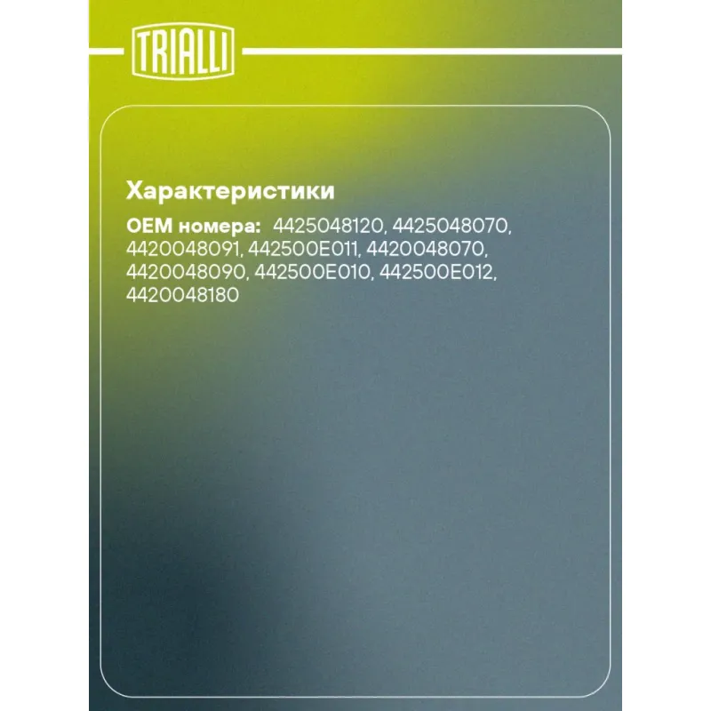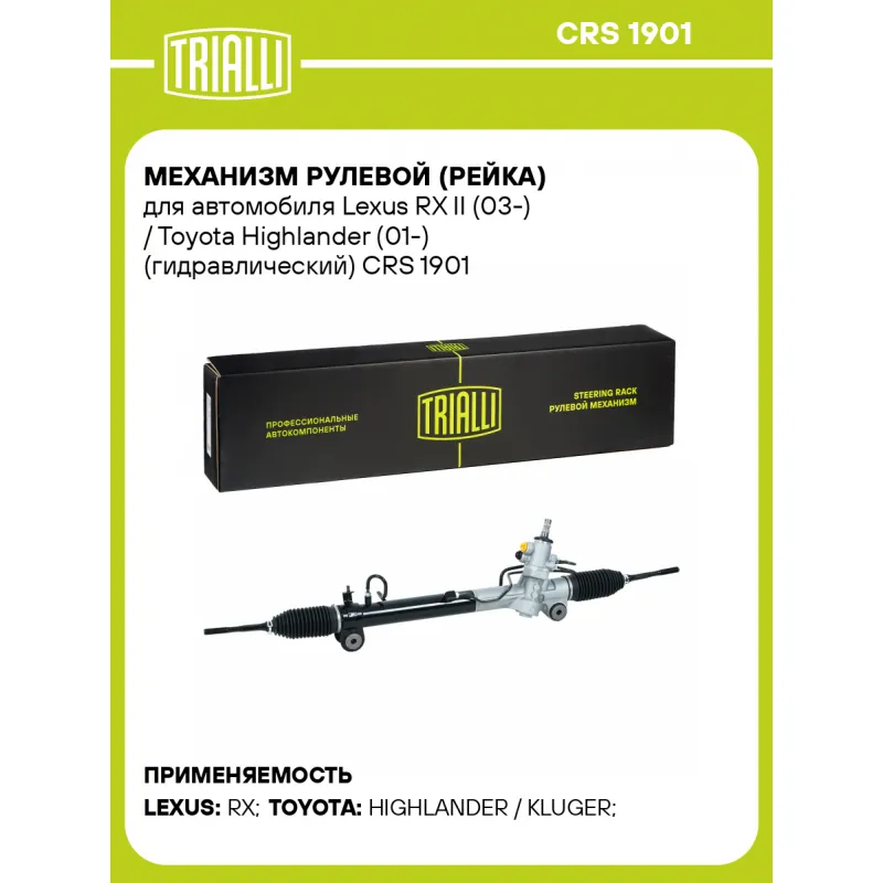 Механизм рулевой (рейка) для автомобиля Lexus RX II (03-) / Toyota Highlander (01-) (гидравлический) Описание: Рулевой механизм реечного типа CRS 1901 бренда TRIALLI предназначен для передачи момента поворота с рулевого колеса на передние колеса автомобиля. Предназначен для автомобилей LEXUS RX, TOYOTA HIGHLANDER / KLUGER. Подбор по VIN-номеру вашего автомобиля - через кнопку 'Задать вопрос'. Специалист проверит применяемость и ответит вам. Особенности рулевых реек Trialli:• Тип рулевого механизма - гидравлический. • Соответствие стандартам. Продукция сертифицирована по ГОСТ и международным стандартам ISO и EAC. Это подтверждает высокое качество, безопасность и надежность каждой детали. • Надежность в любых климатических условиях. Используются адаптированные смазочные материалы, которые сохраняют рабочие свойства при температуре от ?45 до +80°C. • Современное производство. Рулевые рейки изготавливаются на высокоточном автоматизированном оборудовании. Это снижает вероятность брака и обеспечивает стабильное качество. • Многоступенчатый контроль качества. Каждое изделие проходит до 5 этапов контроля: проверка сырья, промежуточный контроль, стендовые испытания и финальная проверка. • Лабораторные испытания: проверяются герметичность, износостойкость, устойчивость к нагрузкам и внешним воздействиям. Отличный выбор для надежной замены штатного реечного механизма. Характеристики: Артикул: CRS 1901 OEM номера: 4425048120, 4425048070, 4420048091, 442500E011, 4420048070, 4420048090, 442500E010, 442500E012, 4420048180 Материал: Комбинированный Особенности конструкции:: с рулевыми тягами, без рулевых наконечников Длина, мм: 1118 Количество оборотов рулевого механизма: 3 Гарантийный срок: 2 года/60 000 км Сторона установки: Слева Товарная линейка: BLACK Тип рулевого механизма: гидравлический Количество на автомобиль: 1 Комплектация: Рулевой механизм (рейка) - 1 шт Гарантия: от 1 года.