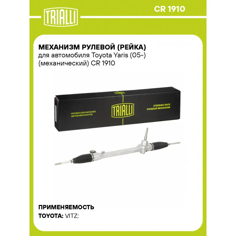 Механизм рулевой (рейка) для автомобиля Toyota Yaris (05-) (механический) Описание: Рулевой механизм реечного типа CR 1910 бренда TRIALLI предназначен для передачи момента поворота с рулевого колеса на передние колеса автомобиля. Предназначен для автомобилей TOYOTA YARIS. Подбор по VIN-номеру вашего автомобиля - через кнопку 'Задать вопрос'. Специалист проверит применяемость и ответит вам. Особенности рулевых реек Trialli:• Тип рулевого механизма - механический. • Соответствие стандартам. Продукция сертифицирована по ГОСТ и международным стандартам ISO и EAC. Это подтверждает высокое качество, безопасность и надежность каждой детали. • Надежность в любых климатических условиях. Используются адаптированные смазочные материалы, которые сохраняют рабочие свойства при температуре от ?45 до +80°C. • Современное производство. Рулевые рейки изготавливаются на высокоточном автоматизированном оборудовании. Это снижает вероятность брака и обеспечивает стабильное качество. • Многоступенчатый контроль качества. Каждое изделие проходит до 5 этапов контроля: проверка сырья, промежуточный контроль, стендовые испытания и финальная проверка. • Лабораторные испытания: проверяются герметичность, износостойкость, устойчивость к нагрузкам и внешним воздействиям. Отличный выбор для надежной замены штатного реечного механизма. Характеристики: Артикул: CR 1910 OEM номера: 45510-52140, 455000D110, 455100D150, 4551052190, 4551052080, 455000D111, 4551052141, 455100D170 Материал: Комбинированный Особенности конструкции:: с рулевыми тягами, без рулевых наконечников Длина, мм: 1065 Количество оборотов рулевого механизма: 3,1 Гарантийный срок: 2 года/60 000 км Сторона установки: Слева Товарная линейка: BLACK Тип рулевого механизма: механический Количество на автомобиль: 1 Комплектация: Рулевой механизм (рейка) - 1 шт Гарантия: от 1 года.