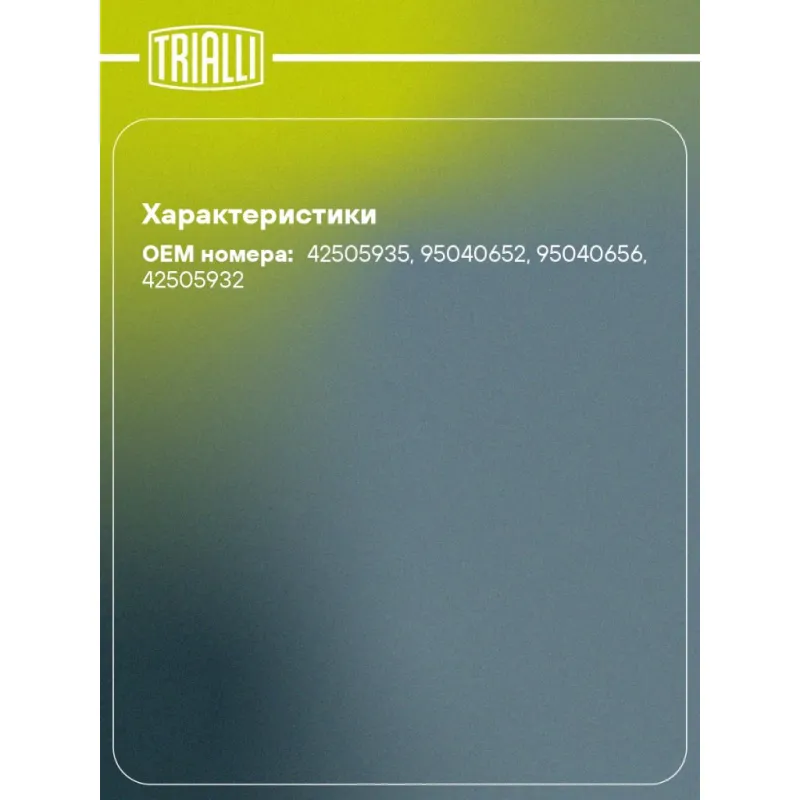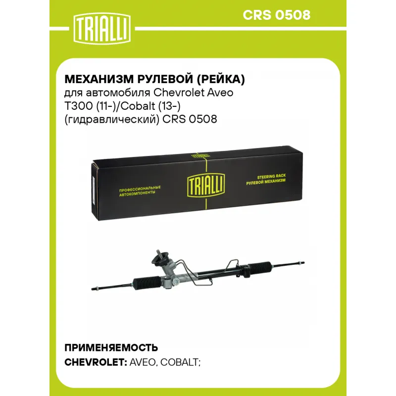 Механизм рулевой (рейка) для автомобиля Chevrolet Aveo T300 (11-)/Cobalt (13-) (гидравлический) Описание: Рулевой механизм реечного типа CRS 0508 бренда TRIALLI предназначен для передачи момента поворота с рулевого колеса на передние колеса автомобиля. Предназначен для автомобилей CHEVROLET AVEO, COBALT. Подбор по VIN-номеру вашего автомобиля - через кнопку 'Задать вопрос'. Специалист проверит применяемость и ответит вам. Особенности рулевых реек Trialli:• Тип рулевого механизма - гидравлический. • Соответствие стандартам. Продукция сертифицирована по ГОСТ и международным стандартам ISO и EAC. Это подтверждает высокое качество, безопасность и надежность каждой детали. • Надежность в любых климатических условиях. Используются адаптированные смазочные материалы, которые сохраняют рабочие свойства при температуре от ?45 до +80°C. • Современное производство. Рулевые рейки изготавливаются на высокоточном автоматизированном оборудовании. Это снижает вероятность брака и обеспечивает стабильное качество. • Многоступенчатый контроль качества. Каждое изделие проходит до 5 этапов контроля: проверка сырья, промежуточный контроль, стендовые испытания и финальная проверка. • Лабораторные испытания: проверяются герметичность, износостойкость, устойчивость к нагрузкам и внешним воздействиям. Отличный выбор для надежной замены штатного реечного механизма. Характеристики: Артикул: CRS 0508 OEM номера: 42505935, 95040652, 95040656, 42505932 Материал: Комбинированный Особенности конструкции:: с рулевыми тягами, без рулевых наконечников Длина, мм: 1258 Количество оборотов рулевого механизма: 2,81 Гарантийный срок: 2 года/60 000 км Сторона установки: Слева Товарная линейка: BLACK Тип рулевого механизма: гидравлический Количество на автомобиль: 1 Комплектация: Рулевой механизм (рейка) - 1 шт Гарантия: от 1 года.