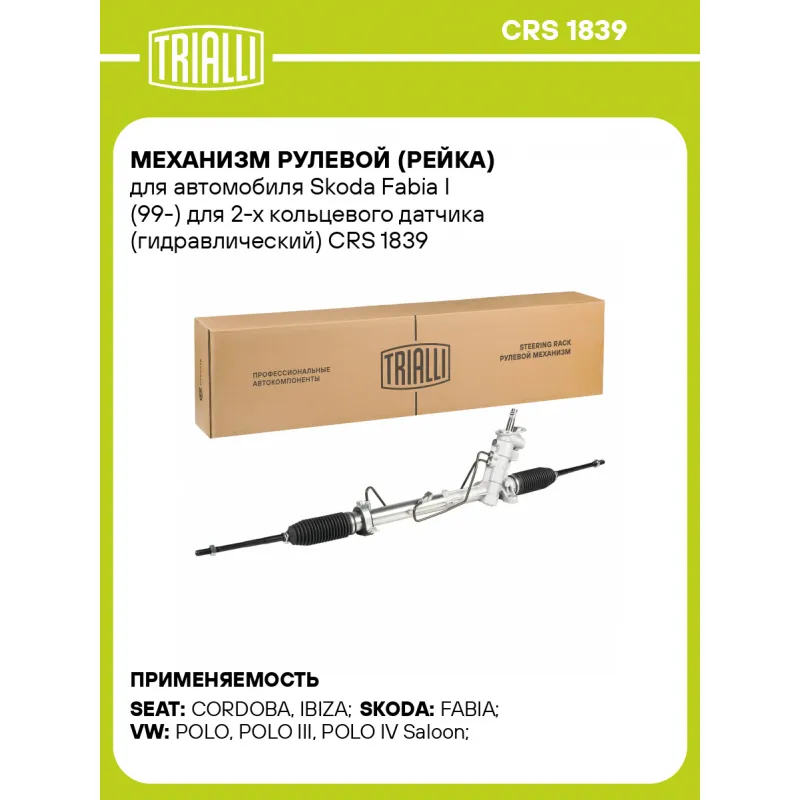 Механизм рулевой (рейка) для автомобиля Skoda Fabia I (99-) для 2-х кольцевого датчика (гидравлический) Описание: Рулевой механизм реечного типа CRS 1839 бренда TRIALLI предназначен для передачи момента поворота с рулевого колеса на передние колеса автомобиля. Предназначен для автомобилей SEAT CORDOBA, IBIZA, SKODA FABIA, VW POLO. Подбор по VIN-номеру вашего автомобиля - через кнопку 'Задать вопрос'. Специалист проверит применяемость и ответит вам. Особенности рулевых реек Trialli:• Тип рулевого механизма - гидравлический. • Соответствие стандартам. Продукция сертифицирована по ГОСТ и международным стандартам ISO и EAC. Это подтверждает высокое качество, безопасность и надежность каждой детали. • Надежность в любых климатических условиях. Используются адаптированные смазочные материалы, которые сохраняют рабочие свойства при температуре от ?45 до +80°C. • Современное производство. Рулевые рейки изготавливаются на высокоточном автоматизированном оборудовании. Это снижает вероятность брака и обеспечивает стабильное качество. • Многоступенчатый контроль качества. Каждое изделие проходит до 5 этапов контроля: проверка сырья, промежуточный контроль, стендовые испытания и финальная проверка. • Лабораторные испытания: проверяются герметичность, износостойкость, устойчивость к нагрузкам и внешним воздействиям. Отличный выбор для надежной замены штатного реечного механизма. Характеристики: Артикул: CRS 1839 OEM номера: 6Q1423051AQ, 6Q1423055AD, 6Q1423055X, 6Q1423051CE, 6Q1423055BM, 6Q1423062FX, 6Q1423070X, 6Q1423061SX, 6Q1423051AS, 6Q1423055AX, 6Q1423061N, 6Q1423051CG, 6Q1423055BX, 6Q1423051CA, 6Q1423055BA, 6Q1423061NX, 6Q1423055Q, 6Q1423051CC, 6Q1423055BL Материал: Комбинированный Особенности конструкции:: с рулевыми тягами, без рулевых наконечников Длина, мм: 1181 Количество оборотов рулевого механизма: 2,8 Гарантийный срок: 2 года/60 000 км Сторона установки: Слева Товарная линейка: BLACK Тип рулевого механизма: гидравлический Количество на автомобиль: 1 Комплектация: Рулевой механизм (рейка) - 1 шт Гарантия: от 1 года.