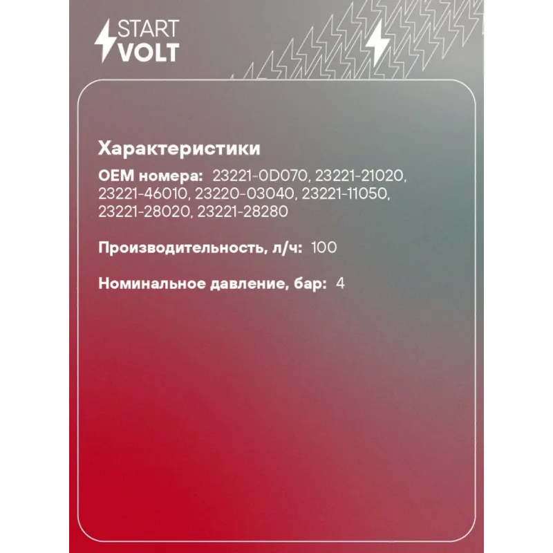 Мотор бензонасоса для автомобилей Toyota Camry V30 (01-) 2.4i/Harrier (97-) 2.2i (SFP 1902) Характеристики: Артикул: SFP 1902 OEM номера: 23221-0D070, 23221-21020, 23221-46010, 23220-03040, 23221-11050, 23221-28020, 23221-28280 Производительность, л/ч: 100 Номинальное давление, бар: 4 Количество на автомобиль: 1 Комплектация: Пасопрт изделия/гарантийный талон - 1 шт Фильтр топливный - 1 шт Топливный насос - 1 шт Гарантия: от 1 года.