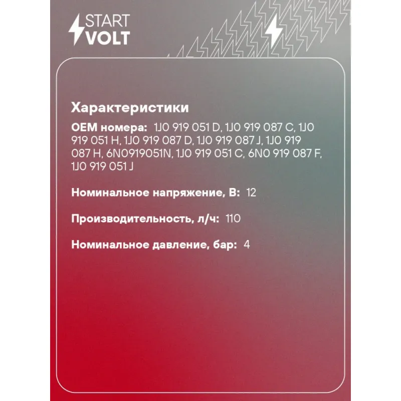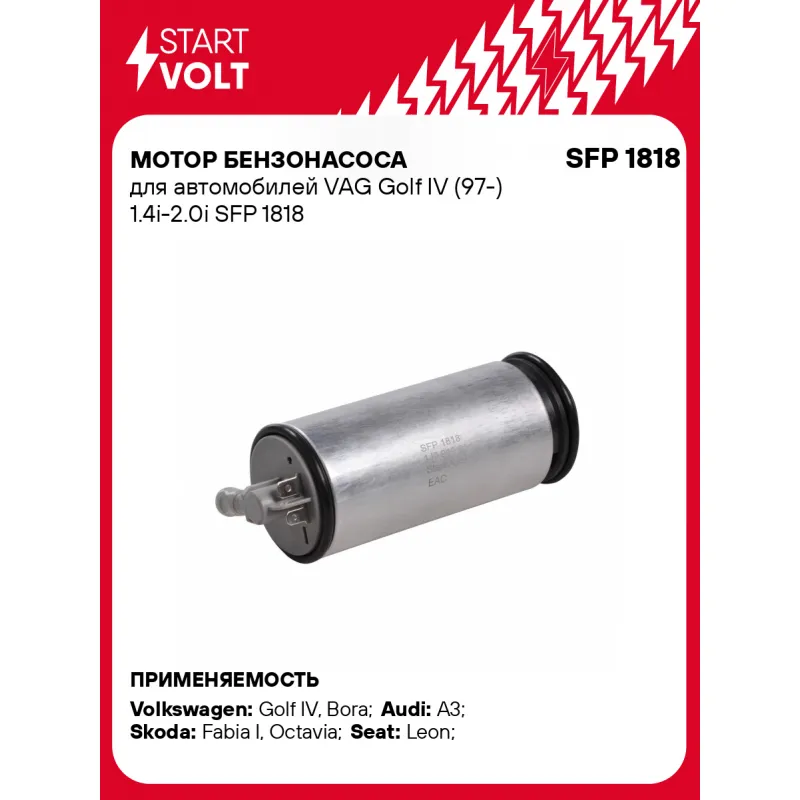 Мотор бензонасоса для автомобилей VAG Golf IV (97-) 1.4i-2.0i Характеристики: Артикул: SFP 1818 OEM номера: 1J0 919 051 D, 1J0 919 087 C , 1J0 919 051 H, 1J0 919 087 D , 1J0 919 087 J , 1J0 919 087 H , 1J0 919 051 C , 6N0 919 087 F, 1J0 919 051 J, 6Q0919051F, 3B0919051C, 4B0919051E, 6N0919051N Количество на автомобиль: 1 Номинальное напряжение, В: 12 Производительность, л/ч: 110 Номинальное давление, бар: 4 Подходит для авто: Volkswagen Golf IV (97-), Bora (99-), Bora (99-), Golf IV (97-), Bora (99-) Audi A3 (96-), A3 (96-) Skoda Fabia I (99-), Octavia (96-) Seat Leon (99-) Для проверки применяемости отправьте VIN автомобиля через вкладку "Есть вопросы о товаре?" Комплектация: Паспорт изделия/гарантийный талон - 1 шт Уплотнительное кольцо - 2 шт Топливный насос - 1 шт Гарантия: от 1 года.
