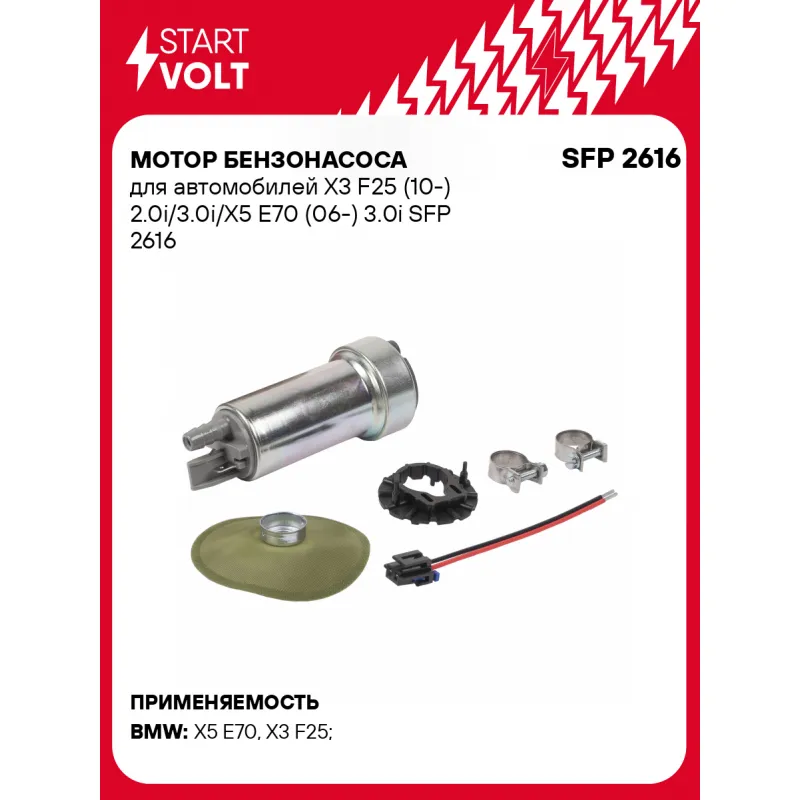 Мотор бензонасоса для автомобилей X3 F25 (10-) 2.0i/3.0i/X5 E70 (06-) 3.0i Характеристики: Артикул: SFP 2616 OEM номера: 16 11 7 207 599, 16 11 7 285 443, 0 986 580 426 Производительность, л/ч: 230 Сила тока, А: 12 Номинальное давление, бар: 3 Количество на автомобиль: 1 Подходит для авто: BMW X5 E70 (07-), X3 F25 (10-) Для... Читать полностью →