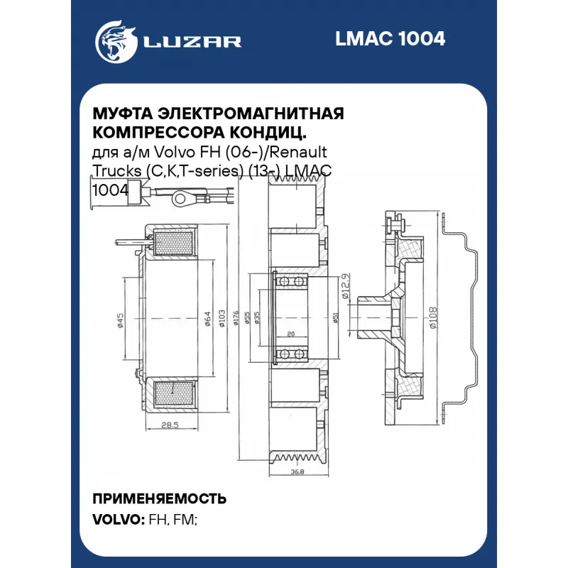 Муфта электромагнитная компрессора кондиц. для а/м Volvo FH (06-)/Renault Trucks (C,K,T-series) (13-) Характеристики: Артикул: LMAC 1004 OEM номера: 7482704531, 20587125, 85000458, 84094705 Тип шкива: 8PK Диаметр шкива: 175 Количество на автомобиль: 1 Напряжение, В: 24 Совместимость с компрессорами LUZAR: Несовместим Ограничение производителя: Sanden Ид.№ компрессора: SD7H15 Совместим с компрессорами кондиционера: 7482704531, 20587125, 85000458, 84094705 Комплектация: Катушка электромагнитная - 1 шт Шкив с подшипником - 1 шт Прижимная пластина - 1 шт Пыльник - 1 шт Паспорт изделия - 1 шт Гарантия: от 1 года.