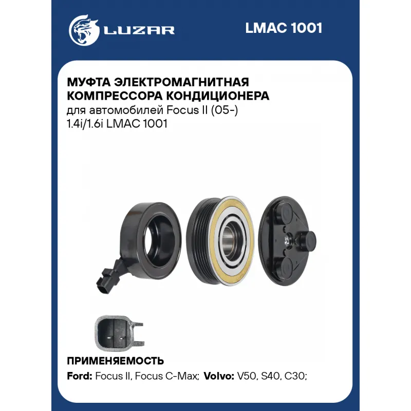 Муфта электромагнитная компрессора кондиционера для автомобилей Focus II (05-) 1.4i/1.6i Характеристики: Артикул: LMAC 1001 OEM номера: 1686883, 3M5H-19D649-FA, 1432750, 1432767, 1678411, 1742258, BV6N19D629AC, BV6N19D629AE, 3M5H19D629PJ, 3M5H19D629PF, 3M5H19D629PE, 3M5H19D629PC, 3M5H19D629PG, BV6N19D629AD, 36002859, 3M5H19497AA, 3M5H19497AC, 3M5H19D629MG, 3M5H19D629PA, 3M5H19D629PH, 1744996, 1779739, 1809656, 1856883, 36000326, 36001440 Сопутствующий товар:: LMCC 1001 Количество на автомобиль: 1 Тип шкива: 5PK Диаметр шкива: 108 мм. Напряжение электромагнитной муфты: 12V Ограничение производителя: VISTEON Ид.№ компрессора: VS-16 Совместимость с компрессорами LUZAR: Несовместим Совместим с компрессорами кондиционера: 1388316, 1432750, 1432767, 1678411, 1742258, 1744996, 1779739, 1809656, 1856883, 36000326, 36001440, 36002859 Подходит для авто: Ford Focus II (05-), Focus C-Max (03-), Focus III (11-) Volvo V50 (04-), S40 (04-), C30 (06-) Для проверки применяемости отправьте VIN автомобиля через вкладку "Есть вопросы о товаре?" Комплектация: Катушка электромагнитная - 1 шт Шкив с подшипником - 1 шт Прижимная пластина - 1 шт Паспорт изделия - 1 шт Гарантия: от 1 года.