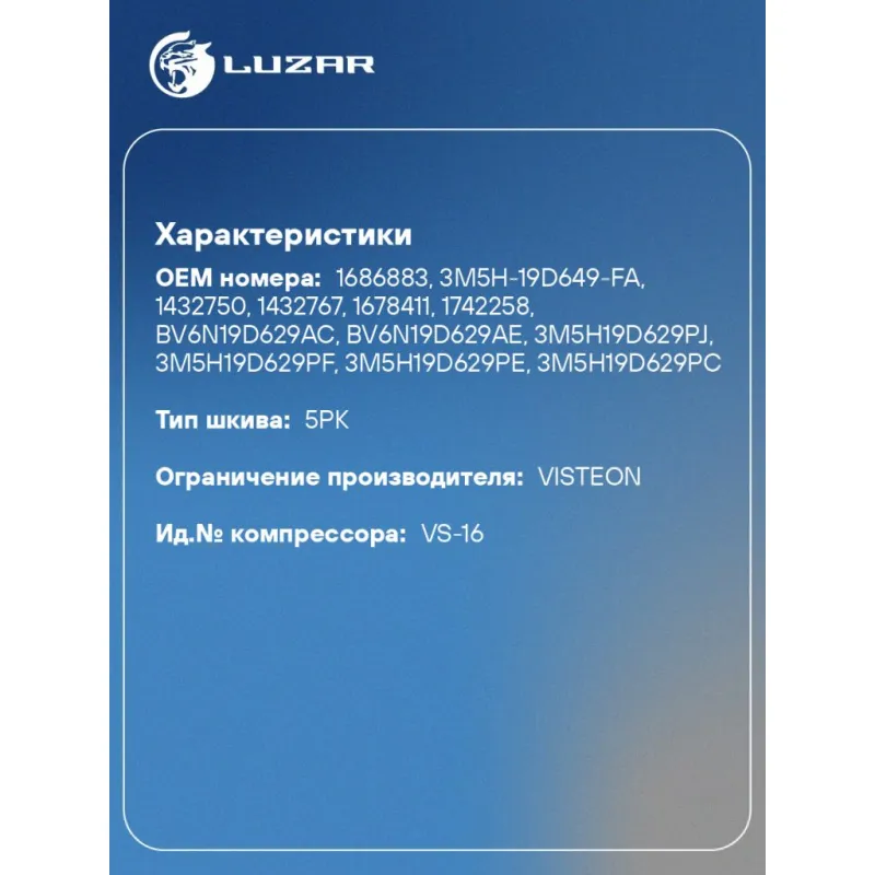 | Совместим с компрессорами кондиционера | 1388316, 1432750, 1432767, 1678411, 1742258, 1744996, 1779739, 1809656, 1856883, 36000326, 36001440, 36002859 |