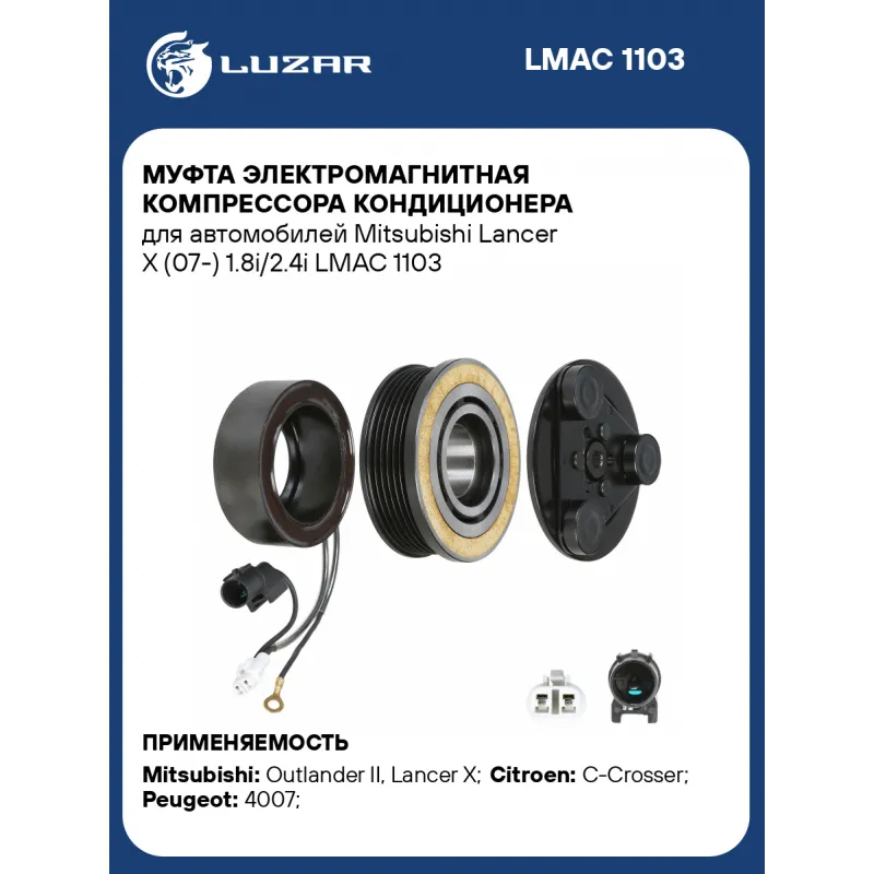 Муфта электромагнитная компрессора кондиционера для автомобилей Mitsubishi Lancer X (07-) 1.8i/2.4i Характеристики: Артикул: LMAC 1103 OEM номера: 7813A130, 7813A235, 7813A068 Тип шкива: 6PK Диаметр шкива: 95 Количество на автомобиль: 1 Напряжение, В: 12 Ограничение производителя: Mitsubishi Ид.№ компрессора: MSC90CAS Совместимость с компрессорами LUZAR: Несовместим Совместим с компрессорами кондиционера: 7813A130, 7813A235, 7813A068 Подходит для авто: Mitsubishi Outlander II (06-), Lancer X (07-) Citroen C-Crosser (07-) Peugeot 4007 (07-) Для проверки применяемости отправьте VIN автомобиля через вкладку "Есть вопросы о товаре?" Комплектация: Катушка электромагнитная - 1 шт Шкив - 1 шт Прижимная пластина - 1 шт Паспорт изделия - 1 шт Гарантия: от 1 года.