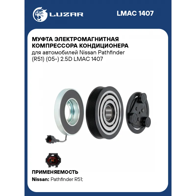 Муфта электромагнитная компрессора кондиционера для автомобилей Nissan Pathfinder (R51) (05-) 2.5D Характеристики: Артикул: LMAC 1407 OEM номера: 92660-EB300, 92600-EB01A, 92660-EB01B Тип шкива: 7PK Диаметр шкива: 135 Сопутствующий товар:: LMCC 1407 Количество на автомобиль: 1 Напряжение, В: 12 Ограничение производителя: Valeo/Zexel Ид.№ компрессора: DKS17D Совместимость с компрессорами LUZAR: Несовместим Совместим с компрессорами кондиционера: 92600-EB01A, 92660-EB01B, 92660-EB300 Подходит для авто: Nissan Pathfinder R51 (05-) Для проверки применяемости отправьте VIN автомобиля через вкладку "Есть вопросы о товаре?" Комплектация: Катушка электромагнитная - 1 шт Шкив с подшипником - 1 шт Прижимная пластина - 1 шт Паспорт изделия - 1 шт Гарантия: от 1 года.