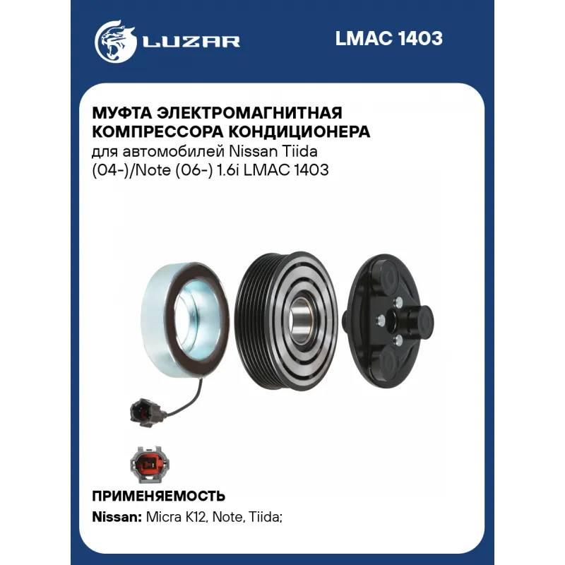 Муфта электромагнитная компрессора кондиционера для автомобилей Nissan Tiida (04-)/Note (06-) 1.6i Характеристики: Артикул: LMAC 1403 OEM номера: 92660-CJ700, 92660-CJ71B, 92600-CJ70B, 92600-CJ700 Тип шкива: 7PK Диаметр шкива: 110 Количество на автомобиль: 1 Напряжение, В: 12 Ограничение производителя: Calsonic Kansei Ид.№ компрессора: CR-10 Совместимость с компрессорами LUZAR: Несовместим Совместим с компрессорами кондиционера: 92600-CJ700, 92600-CJ70B, 92660-CJ700, 92660-CJ71B Подходит для авто: Nissan Micra K12 (02-), Note (06-), Tiida (04-) Для проверки применяемости отправьте VIN автомобиля через вкладку "Есть вопросы о товаре?" Комплектация: Катушка электромагнитная - 1 шт Шкив с подшипником - 1 шт Прижимная пластина - 1 шт Паспорт изделия - 1 шт Гарантия: от 1 года.