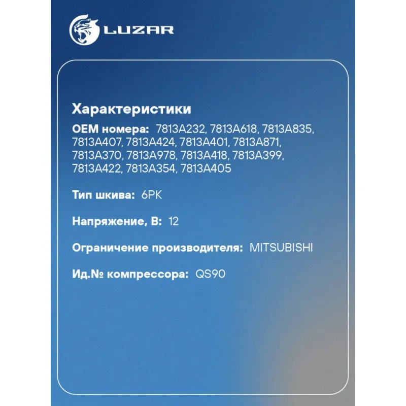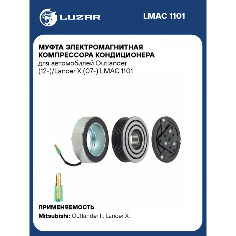 Муфта электромагнитная компрессора кондиционера для автомобилей Outlander (12-)/Lancer X (07-) Характеристики: Артикул: LMAC 1101 OEM номера: 7813A232, 7813A618, 7813A835, 7813A407, 7813A424, 7813A401, 7813A871, 7813A370, 7813A978, 7813A418, 7813A399, 7813A422, 7813A354, 7813A405, 7813A197, 7813A750, 7813A403, 7813A620, 7813A359, 7813A480, 7813A350, 7813A212 Количество на автомобиль: 1 Тип шкива: 6PK Диаметр шкива: 95 мм. Напряжение, В: 12 Ограничение производителя: MITSUBISHI Ид.№ компрессора: QS90 Совместимость с компрессорами LUZAR: Несовместим Совместим с компрессорами кондиционера: 7813A418, 7813A618, 7813A835, 7813A407, 7813A424, 7813A401, 7813A403, 7813A420, 7813A620, 7813A359, 7813A480, 7813A350, 7813A212, 7813A399, 7813A422, 7813A354, 7813A405, 7813A197, 7813A750, 7813A871, 7813A370, 7813A978 Подходит для авто: Mitsubishi Outlander II (06-), Lancer X (07-), ASX (10-), Outlander III (12-) Для проверки применяемости отправьте VIN автомобиля через вкладку "Есть вопросы о товаре?" Комплектация: Катушка электромагнитная - 1 шт Шкив с подшипником - 1 шт Прижимная пластина - 1 шт Паспорт изделия - 1 шт Гарантия: от 1 года.