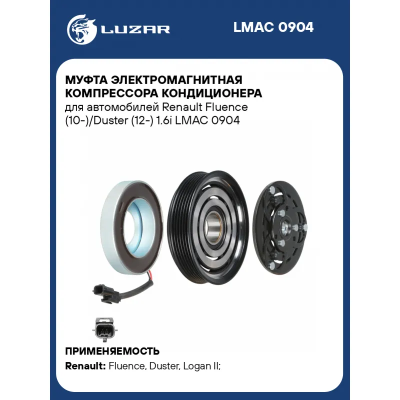 Муфта электромагнитная компрессора кондиционера для автомобилей Renault Fluence (10-)/Duster (12-) 1.6i Характеристики: Артикул: LMAC 0904 OEM номера: 926009154R Тип шкива: 6PK Диаметр шкива: 124 Количество на автомобиль: 1 Напряжение, В: 12 Ограничение производителя: Valeo/Zexel Ид.№ компрессора: DKV-11R Совместимость с компрессорами LUZAR: Несовместим Совместим с компрессорами кондиционера: 926009154R Подходит для авто: Renault Fluence (10-), Duster (10-), Logan II (12-), Sandero II (14-) Для проверки применяемости отправьте VIN автомобиля через вкладку "Есть вопросы о товаре?" Комплектация: Катушка электромагнитная - 1 шт Шкив - 1 шт Прижимная пластина - 1 шт Паспорт изделия - 1 шт Гарантия: от 1 года.