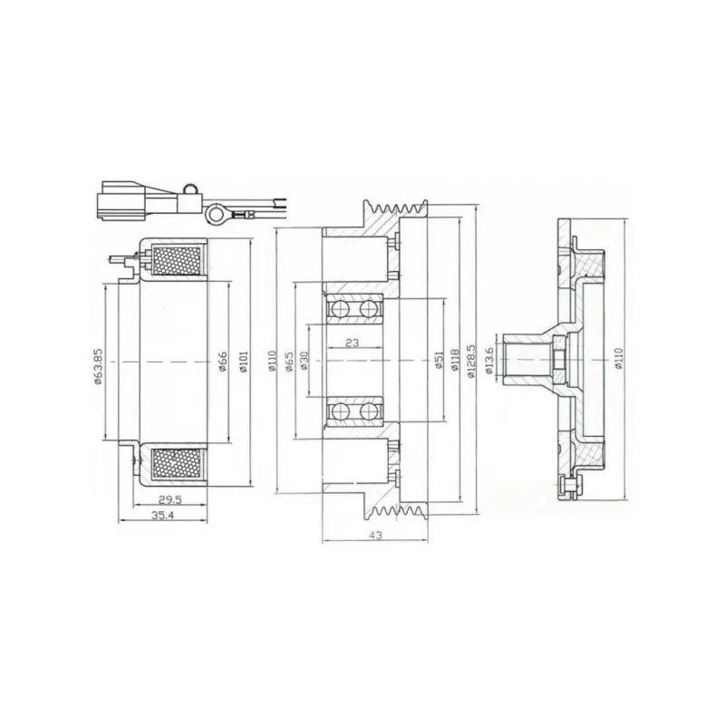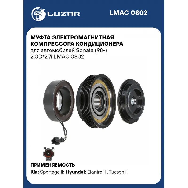 Муфта электромагнитная компрессора кондиционера для автомобилей Sonata (98-) 2.0D/2.7i Характеристики: Артикул: LMAC 0802 OEM номера: 97701-38171, 97641-39000, 977012D400, 977012D200, 97641-3A570, 97643-3A670, 9770139180, 97701-38170, 97643-38100, 97644-39000, 977013A480, 97644-3A570, 97701-3A470, 97643-38020, 97701-3A471, 9770126200, 9770126300 Количество на автомобиль: 1 Тип шкива: 6PK Диаметр шкива: 128 мм. Напряжение, В: 12 Ид.№ компрессора: HS-17 Совместимость с компрессорами LUZAR: Несовместим Совместим с компрессорами кондиционера: 9770126200, 9770126300, 977012D200, 977012D400, 97701-38170, 97701-38171, 9770139180, 97701-3A470, 97701-3A471, 977013A480 Ограничение производителя: HALLA (HCC) Подходит для авто: Kia Sportage II (04-) Hyundai Elantra III (00-), Tucson I (04-), Santa Fe (00-), Sonata IV (EF) (98-) Для проверки применяемости отправьте VIN автомобиля через вкладку "Есть вопросы о товаре?" Комплектация: Катушка электромагнитная - 1 шт Шкив - 1 шт Прижимная пластина - 1 шт Паспорт изделия - 1 шт Гарантия: от 1 года.