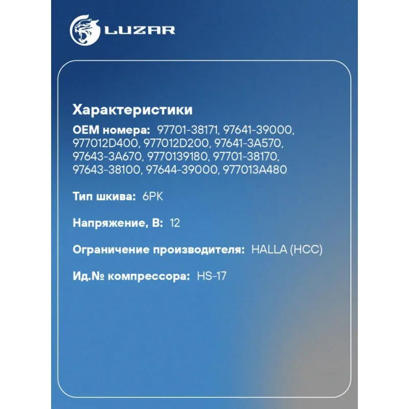 | Совместим с компрессорами кондиционера | 9770126200, 9770126300, 977012D200, 977012D400, 97701-38170, 97701-38171, 9770139180, 97701-3A470, 97701-3A471, 977013A480 |