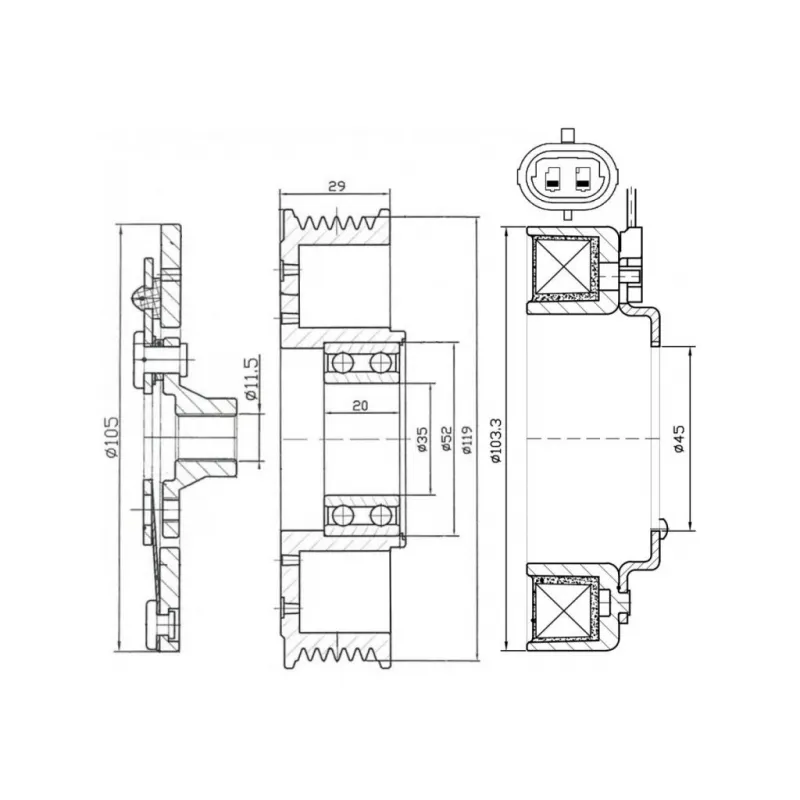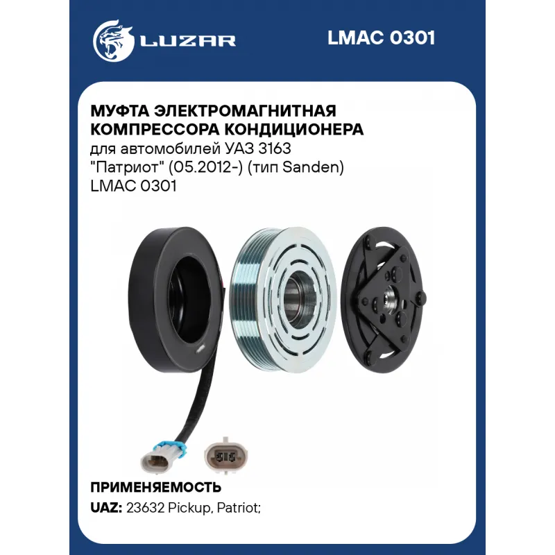 Муфта электромагнитная компрессора кондиционера для автомобилей УАЗ 3163 "Патриот" (05.2012-) (тип Sanden) Характеристики: Артикул: LMAC 0301 OEM номера: 316300813101030, 3163813101030 Тип шкива: 6PK Диаметр шкива: 119 Количество на автомобиль: 1 Напряжение, В: 12 Ограничение производителя: SANDEN Ид.№ компрессора: SD7V16 Совместимость с компрессорами LUZAR: Несовместим Совместим с компрессорами кондиционера: 316300813101030, 3163813101030 Подходит для авто: УАЗ 23632 Pickup (08-), Patriot (08-) Для проверки применяемости отправьте VIN автомобиля через вкладку "Есть вопросы о товаре?" Комплектация: Катушка электромагнитная - 1 шт Шкив с подшипником - 1 шт Прижимная пластина - 1 шт Паспорт изделия - 1 шт Гарантия: от 1 года.