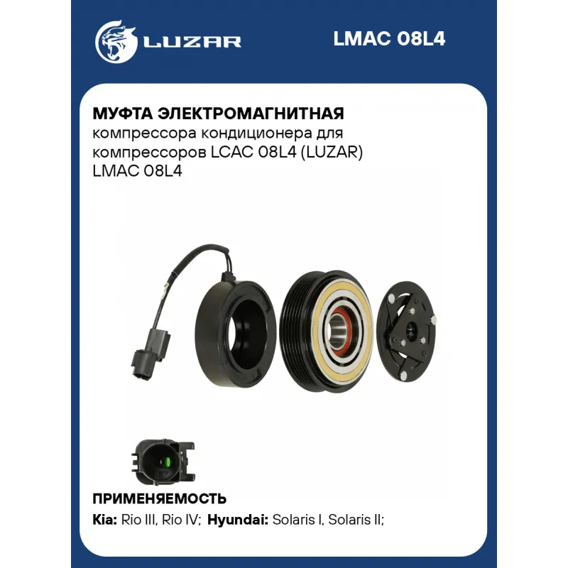 Муфта электромагнитная компрессора кондиционера для компрессоров LCAC 08L4 (LUZAR) Характеристики: Артикул: LMAC 08L4 OEM номера: LCAC 08L4 Тип шкива: 6PK Диаметр шкива: 113 Сопутствующий товар:: LCAC 08L4 Количество на автомобиль: 1 Напряжение, В: 12 Ограничение производителя: LUZAR Ид.№ компрессора: DF11 Совместимость с компрессорами LUZAR: Совместим с LCAC 08L4 Подходит для авто: Kia Rio III (11-), Rio IV (17-), Rio IV (17-) Hyundai Solaris I (10-), Solaris II (17-) Для проверки применяемости отправьте VIN автомобиля через вкладку "Есть вопросы о товаре?" Комплектация: Катушка электромагнитная - 1 шт Шкив с подшипником - 1 шт Прижимная пластина - 1 шт Гарантия: от 1 года.