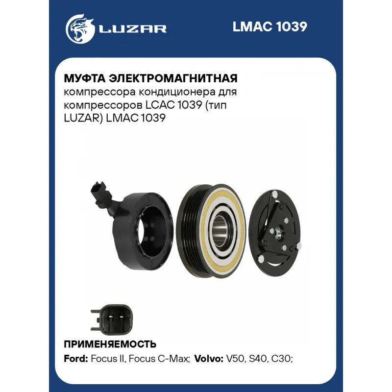 Муфта электромагнитная компрессора кондиционера для компрессоров LCAC 1039 (тип LUZAR) Характеристики: Артикул: LMAC 1039 OEM номера: LCAC 1039 Тип шкива: 5PK Диаметр шкива: 108 Сопутствующий товар:: LCAC 1039 Количество на автомобиль: 1 Напряжение, В: 12 Ограничение производителя: LUZAR Ид.№ компрессора: VS-16 Совместимость с компрессорами LUZAR: Совместим с LCAC 1039 Подходит для авто: Ford Focus II (05-), Focus C-Max (03-), Focus III (11-) Volvo V50 (04-), S40 (04-), C30 (06-) Для проверки применяемости отправьте VIN автомобиля через вкладку "Есть вопросы о товаре?" Комплектация: Катушка электромагнитная - 1 шт Шкив с подшипником - 1 шт Прижимная пластина - 1 шт Гарантия: от 1 года.
