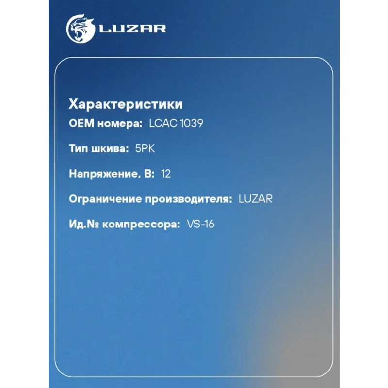 | Совместимость с компрессорами LUZAR | Совместим с LCAC 1039 |