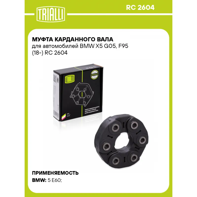 Муфта карданного вала для автомобилей BMW X5 G05, F95 (18-) Характеристики: Артикул: RC 2604 OEM номера: 26 11 7 605 629, 26 11 7 546 425, 26 11 7 610 061 Гарантийный срок: 1 год/30 000км Количество на автомобиль: 1 Материал: Резина/сталь/нейлоновый корд Товарная линейка: BLACK Подходит для авто: BMW 5 E60 (03-) Для проверки применяемости отправьте VIN автомобиля через вкладку "Есть вопросы о товаре?" Комплектация: Муфта - 1 шт Руководство по установке - 1 шт Гарантия: от 1 года.