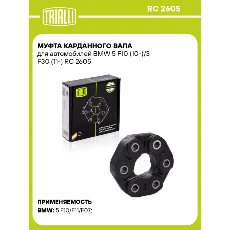 Муфта карданного вала для автомобилей BMW 5 F10 (10-)/3 F30 (11-) Характеристики: Артикул: RC 2605 OEM номера: 26117610372 Гарантийный срок: 1 год/30 000км Количество на автомобиль: 1 Материал: Резина/сталь/нейлоновый корд Товарная линейка: BLACK Подходит для авто: BMW 5 F10/F11/F07 (10-), 5 F10/F11/F07 (10-) Для проверки применяемости отправьте VIN автомобиля через вкладку "Есть вопросы о товаре?" Комплектация: Муфта - 1 шт Руководство по установке - 1 шт Гарантия: от 1 года.