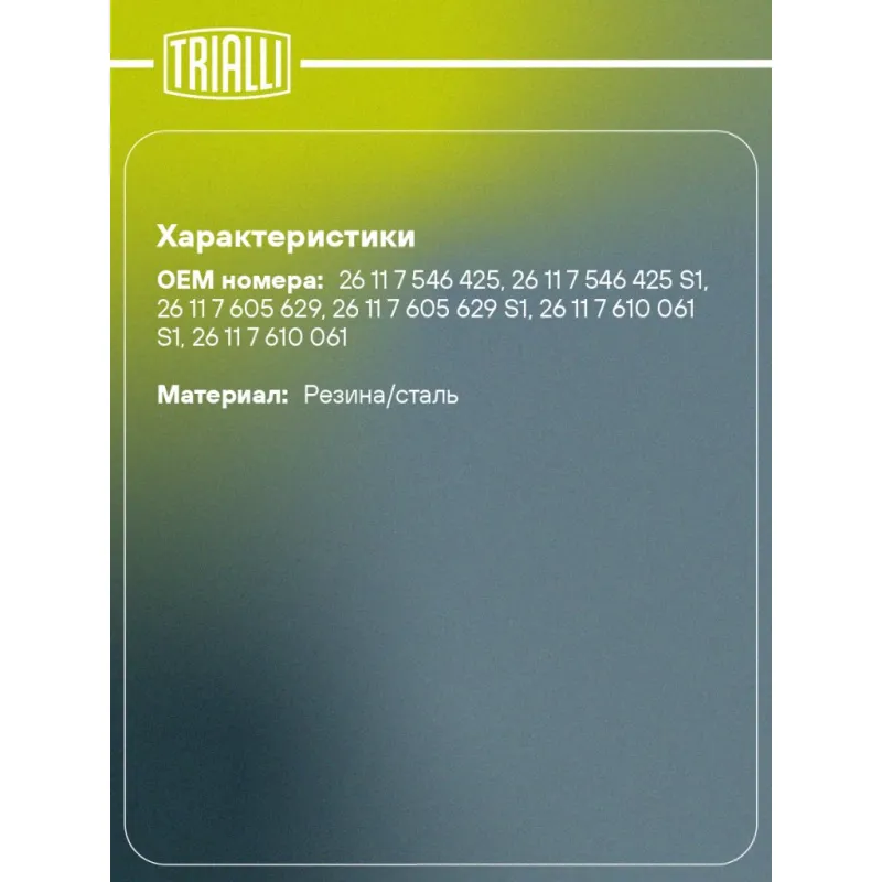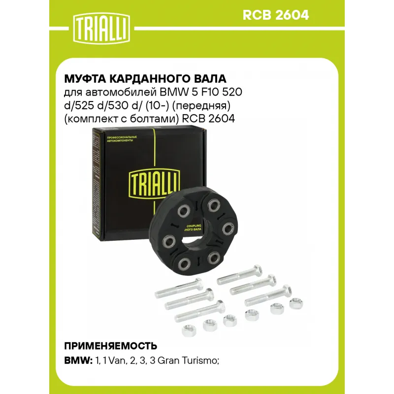 Муфта карданного вала для автомобилей BMW 5 F10 520 d/525 d/530 d/ (10-) (передняя) (комплект с болтами) Характеристики: Артикул: RCB 2604 OEM номера: 26 11 7 546 425, 26 11 7 546 425 S1, 26 11 7 605 629, 26 11 7 605 629 S1, 26 11 7 610 061 S1, 26 11 7 610 061 Материал: Резина/сталь Гарантийный срок: 1 год/ 30 000 км Товарная линейка: BLACK Количество на автомобиль: 1 Комплектация: Руководство по установке - 1 шт Муфта - 1 шт Болт M12x1,5x70 - 6 шт Гайка M12x1,5x18 - 6 шт Гарантия: от 1 года.