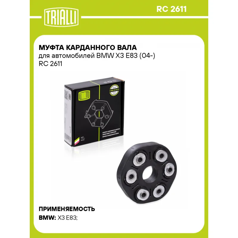 Муфта карданного вала для автомобилей BMW X3 E83 (04-) Характеристики: Артикул: RC 2611 OEM номера: 26117542238 Гарантийный срок: 1 год/30 000км Количество на автомобиль: 1 Материал: Резина/сталь/нейлоновый корд Товарная линейка: BLACK Подходит для авто: BMW X3 E83 (04-) Для проверки применяемости отправьте VIN автомобиля через вкладку "Есть вопросы о товаре?" Комплектация: Муфта - 1 шт Руководство по установке - 1 шт Гарантия: от 1 года.