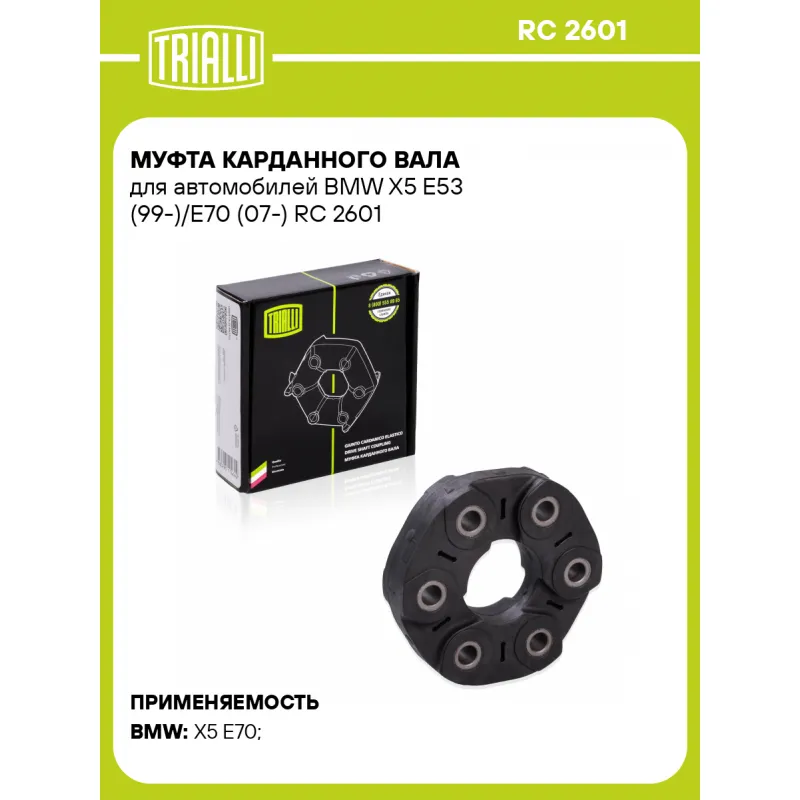 Муфта карданного вала для автомобилей BMW X5 E53 (99-)/E70 (07-) Характеристики: Артикул: RC 2601 OEM номера: 26 11 1 227 717, 26 11 1 229 080, 26 11 1 229 360 Гарантийный срок: 1 год/30 000км Количество на автомобиль: 1 Материал: Резина/сталь/нейлоновый корд Товарная линейка: BLACK Подходит для авто: BMW X5 E70 (07-), X5 E70 (07-) Для проверки применяемости отправьте VIN автомобиля через вкладку "Есть вопросы о товаре?" Комплектация: Муфта - 1 шт Руководство по установке - 1 шт Гарантия: от 1 года.