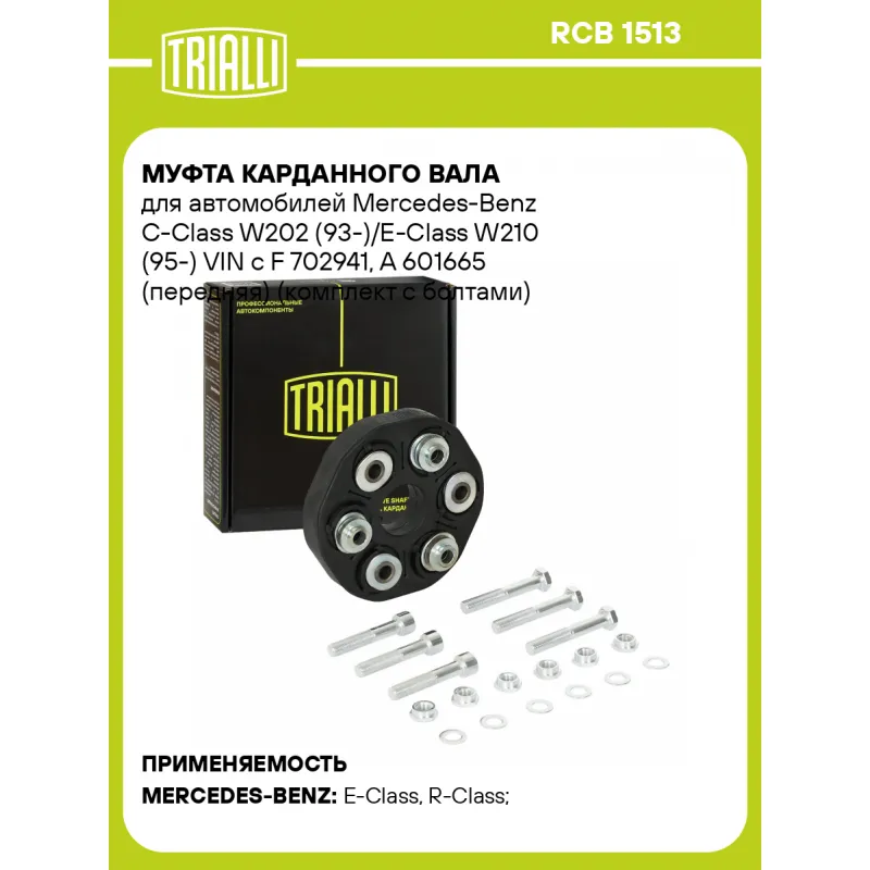 Муфта карданного вала для автомобилей Mercedes-Benz C-Class W202 (93-)/E-Class W210 (95-) VIN с F 702941, A 601665 (передняя) (комплект с болтами) Характеристики: Артикул: RCB 1513 OEM номера: A202 410 11 15, 202 410 11 15 Материал: Резина/сталь Гарантийный срок: 1 год/ 30 000 км Товарная линейка: BLACK Количество на автомобиль: 1 Комплектация: Муфта - 1 шт Болт M10x1x55 - 3 шт Руководство по установке - 1 шт Болт M10x1x65 - 3 шт Шайба - 6 шт Гайка M10x1x17 - 6 шт Гарантия: от 1 года.
