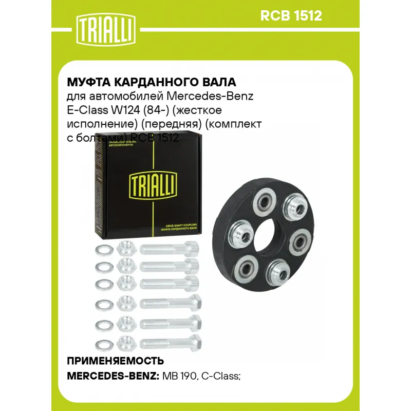 Муфта карданного вала для автомобилей Mercedes-Benz E-Class W124 (84-) (жесткое исполнение) (передняя) (комплект с болтами) Характеристики: Артикул: RCB 1512 OEM номера: A124 410 00 15, A201 410 21 15, A202 410 12 15, 124 410 00 15, 201 410 21 15, 202 410 12 15 Материал: Резина/сталь Гарантийный срок: 1 год/ 30 000 км Товарная линейка: BLACK Количество на автомобиль: 1 Комплектация: Болт M10x1x50 - 3 шт Муфта - 1 шт Руководство по установке - 1 шт Шайба - 6 шт Болт M10x1x60 - 3 шт Гайка M10x1x17 - 6 шт Гарантия: от 1 года.