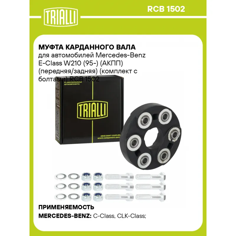 Муфта карданного вала для автомобилей Mercedes-Benz E-Class W210 (95-) (АКПП) (передняя/задняя) (комплект с болтами) Характеристики: Артикул: RCB 1502 OEM номера: A129 410 00 15, A170 410 00 15, A202 410 09 15, A202 410 19 15, A210 410 08 15, 129 410 00 15, 170 410 00 15, 202 410 09 15, 202 410 19 15, 210 410 08 15 Материал: Резина/сталь Гарантийный срок: 1 год/ 30 000 км Товарная линейка: BLACK Количество на автомобиль: 1 Комплектация: Муфта - 1 шт Болт M12x1,5x55 - 3 шт Гайка M12x1,5x19 - 6 шт Болт M12x1,5x60 - 3 шт Шайба - 6 шт Руководство по установке - 1 шт Гарантия: от 1 года.