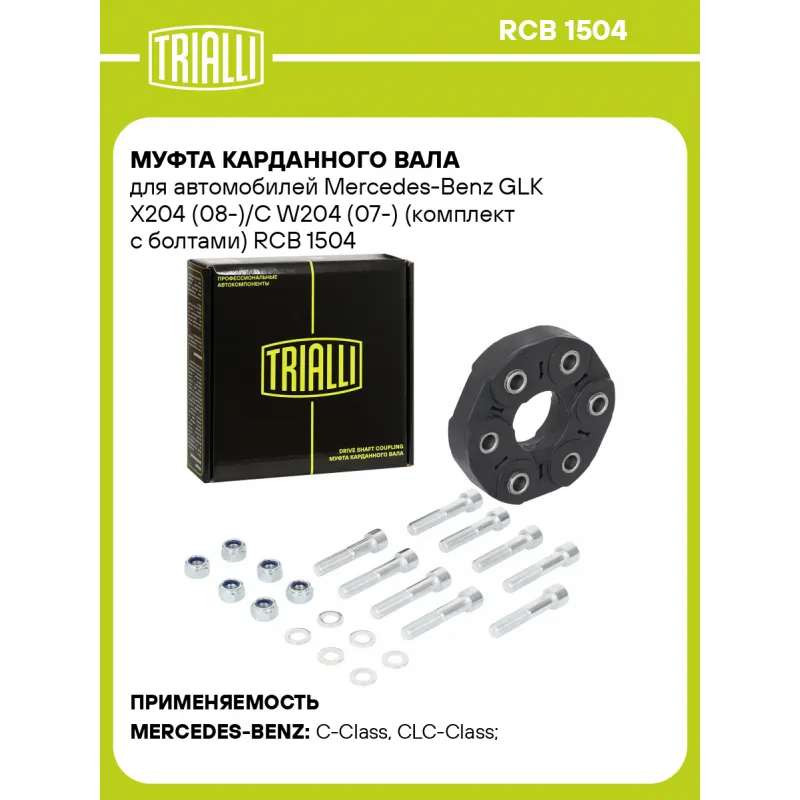Муфта карданного вала для автомобилей Mercedes-Benz GLK X204 (08-)/C W204 (07-) (комплект с болтами) Характеристики: Артикул: RCB 1504 OEM номера: A000 411 00 00, A170 410 01 15, A202 410 18 15, A210 411 04 15, A210 411 04 15 S1, 000 411 00 00, 1704100115, 210 410 12 15, 210 411 04 15, 210 411 04 15 S1, 2024101815, A2104101215 Материал: Резина/сталь Гарантийный срок: 1 год/ 30 000 км Товарная линейка: BLACK Количество на автомобиль: 1 Комплектация: Руководство по установке - 1 шт Болт M12x1,5x60 - 6 шт Муфта - 1 шт Гайка M12x1,5x19 - 6 шт Болт M12x1,5x55 - 3 шт Шайба - 6 шт Гарантия: от 1 года.
