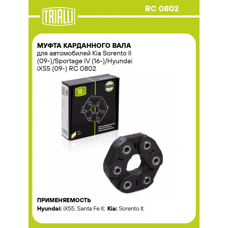 Муфта карданного вала для автомобилей Kia Sorento II (09-)/Sportage IV (16-)/Hyundai iX55 (09-) Характеристики: Артикул: RC 0802 OEM номера: 3320034000 SK, 3320034001 SK, 3320034100 SK, 3320034101 SK, 49130-2B000, 49300-D3000, 49130-2B000 SK, 49130-3W000, 49130-3W000 SK, 49300-D3000 SK Гарантийный срок: 1 год/30 000км Количество на автомобиль: 1 Материал: Резина/сталь/нейлоновый корд Товарная линейка: BLACK КПП: 4AT/5AT/5MT Подходит для авто: Hyundai iX55 (09-), Santa Fe II (06-) Kia Sorento II (09-) Для проверки применяемости отправьте VIN автомобиля через вкладку "Есть вопросы о товаре?" Комплектация: Муфта - 1 шт Руководство по установке - 1 шт Гарантия: от 1 года.