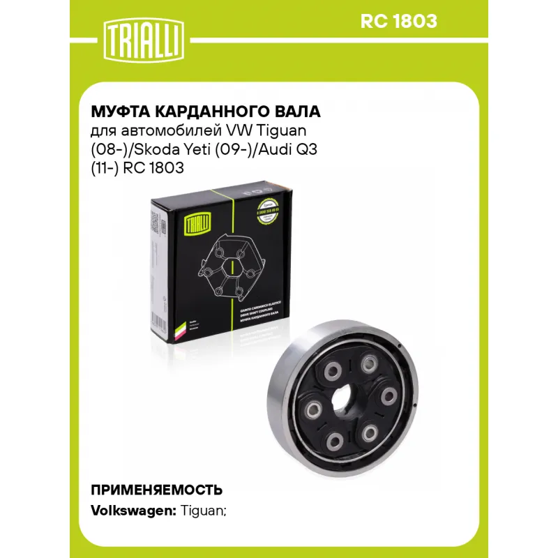 Муфта карданного вала для автомобилей VW Tiguan (08-)/Skoda Yeti (09-)/Audi Q3 (11-) Характеристики: Артикул: RC 1803 OEM номера: 1K0 521 307, 5Q0 521 307, 1K0 521 307 A Гарантийный срок: 1 год/30 000км Количество на автомобиль: 1 Материал: Резина/сталь/нейлоновый корд Товарная линейка: BLACK Подходит для авто: Volkswagen Tiguan (08-) Для проверки применяемости отправьте VIN автомобиля через вкладку "Есть вопросы о товаре?" Комплектация: Муфта - 1 шт Руководство по установке - 1 шт Гарантия: от 1 года.