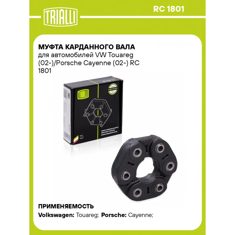 Муфта карданного вала для автомобилей VW Touareg (02-)/Porsche Cayenne (02-) Характеристики: Артикул: RC 1801 OEM номера: 7L0 521 403, 7L6 521 403, 955.421.01000, 955 421 020 21 Гарантийный срок: 1 год/30 000км Количество на автомобиль: 1 Материал: Резина/сталь/нейлоновый корд Товарная линейка: BLACK Подходит для авто: Volkswagen Touareg (02-) Porsche Cayenne (02-) Для проверки применяемости отправьте VIN автомобиля через вкладку "Есть вопросы о товаре?" Комплектация: Муфта - 1 шт Руководство по установке - 1 шт Гарантия: от 1 года.