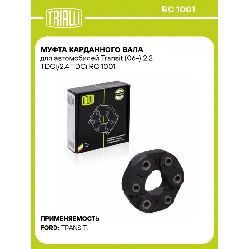 Муфта карданного вала для автомобилей Transit (06-) 2.2 TDCi/2.4 TDCi Характеристики: Артикул: RC 1001 OEM номера: YC1W4684AA, 4 393 343 Гарантийный срок: 1 год/30 000км Количество на автомобиль: 1 Материал: Резина/сталь/нейлоновый корд Товарная линейка: BLACK КПП: MT75 Комплектация: Муфта - 1 шт Руководство по установке - 1 шт Гарантия: от 1 года.