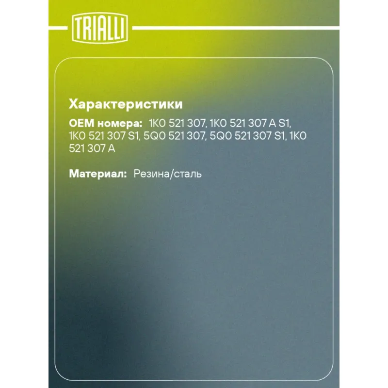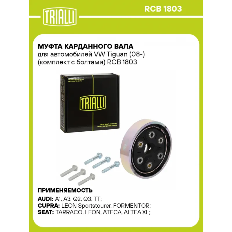 Муфта карданного вала для автомобилей VW Tiguan (08-) (комплект с болтами) Характеристики: Артикул: RCB 1803 OEM номера: 1K0 521 307, 1K0 521 307 A S1, 1K0 521 307 S1, 5Q0 521 307, 5Q0 521 307 S1, 1K0 521 307 A Материал: Резина/сталь Гарантийный срок: 1 год/ 30 000 км Товарная линейка: BLACK Количество на автомобиль: 1 Комплектация: Руководство по установке - 1 шт Муфта - 1 шт Болт M10x52 - 3 шт Болт M10x60 - 3 шт Гарантия: от 1 года.