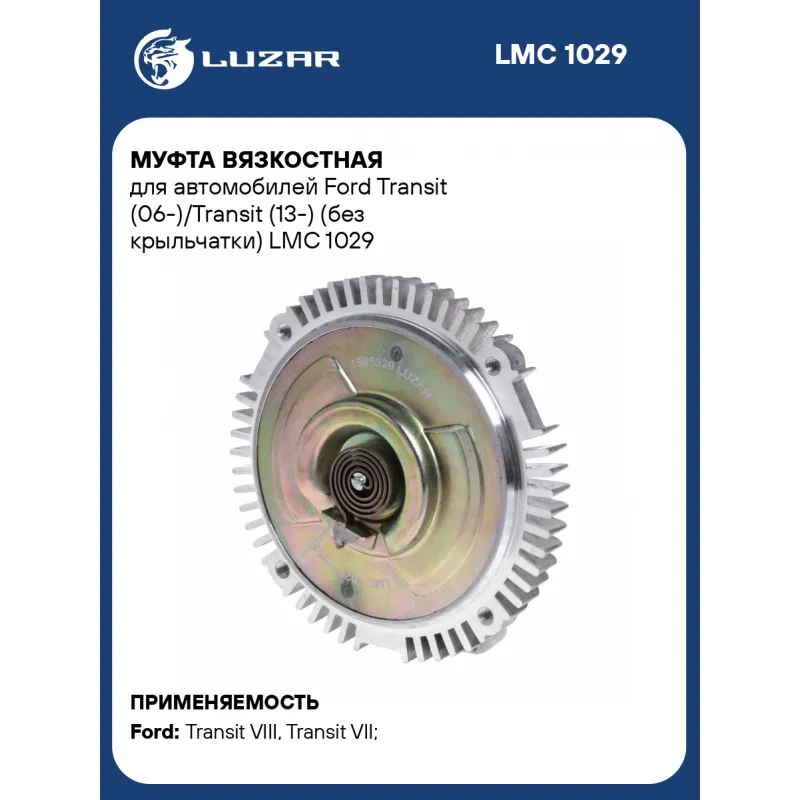 Муфта вязкостная для автомобилей Ford Transit (06-)/Transit (13-) (без крыльчатки) Характеристики: Артикул: LMC 1029 OEM номера: 1695329, 6C118C617CC, 1436157, 6C118C617CA, 1677099, 6C118C617CB, 6C118C617AA, 6C118C617AB Сопутствующий товар: Радиаторы охлаждения: LRc 10AB; LRc 10CC Сопутствующий товар: Насосы водяные (помпы): LWP 1010; LWP 2022 Температура включения, °С: 75 Температура выключения, °С: 55 Количество на автомобиль: 1 Трансмиссия: MT Кондиционер: +/- Подходит для авто: Ford Transit VIII (13-), Transit VII (06-) Для проверки применяемости отправьте VIN автомобиля через вкладку "Есть вопросы о товаре?" Комплектация: Муфта вязкостная - 1 шт Паспорт изделия - 1 шт Гарантия: от 1 года.