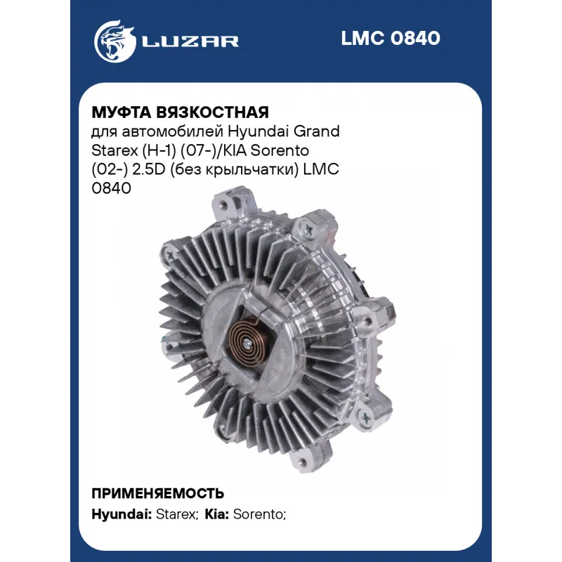Муфта вязкостная для автомобилей Hyundai Grand Starex (H-1) (07-)/KIA Sorento (02-) 2.5D (без крыльчатки) Характеристики: Артикул: LMC 0840 OEM номера: 252374A000, 252374A100 Сопутствующий товар: Радиаторы охлаждения: LRc 081E3; LRc 081H5; LRc 08E1; LRc 08H4; LRc KISo02150; LRc KISo02200 Сопутствующий товар: Насосы водяные (помпы): LWP 0813 Сопутствующий товар: Электровентиляторы кондиционера: LFAC 0804; LFAC 0840 Температура включения, °С: 75 Температура выключения, °С: 55 Количество на автомобиль: 1 Трансмиссия: MT/AT Кондиционер: + Подходит для авто: Hyundai Starex (H-1) (96-), Starex (H-1) (07-) Kia Sorento (02-), Sorento (06-) Для проверки применяемости отправьте VIN автомобиля через вкладку "Есть вопросы о товаре?" Комплектация: Муфта вязкостная - 1 шт Паспорт изделия - 1 шт Гарантия: от 1 года.