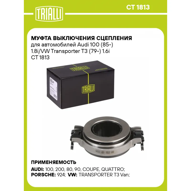 Муфта выключения сцепления для автомобилей Audi 100 (85-) 1.8i/VW Transporter T3 (79-) 1.6i Характеристики: Артикул: CT 1813 OEM номера: 113 141 165 A, 088 141 165 C, 091 141 165, 113 141 165 B, 019 141 165, 088 141 165 B, 091 141 165 A, 088 141 165, 088 141 165 A, 113 141 165 D, 091 141 165 D, 091 141 165 B, 113 141 165, 113 141 165 C Тип привода: механический Гарантийный срок: 1 год/30 000 км Сопутствующий товар: Муфты сцепления: Комбинированный (алюминий, сталь, пластмасса (полиамид), вулканизированная резина (EPDM, NBR)) Количество на автомобиль: 1 Сопутствующие товары:: комплекты сцеплений Товарная линейка: BLACK Комплектация: Муфта выключения сцепления в сборе - 1 шт Гарантия: от 1 года.