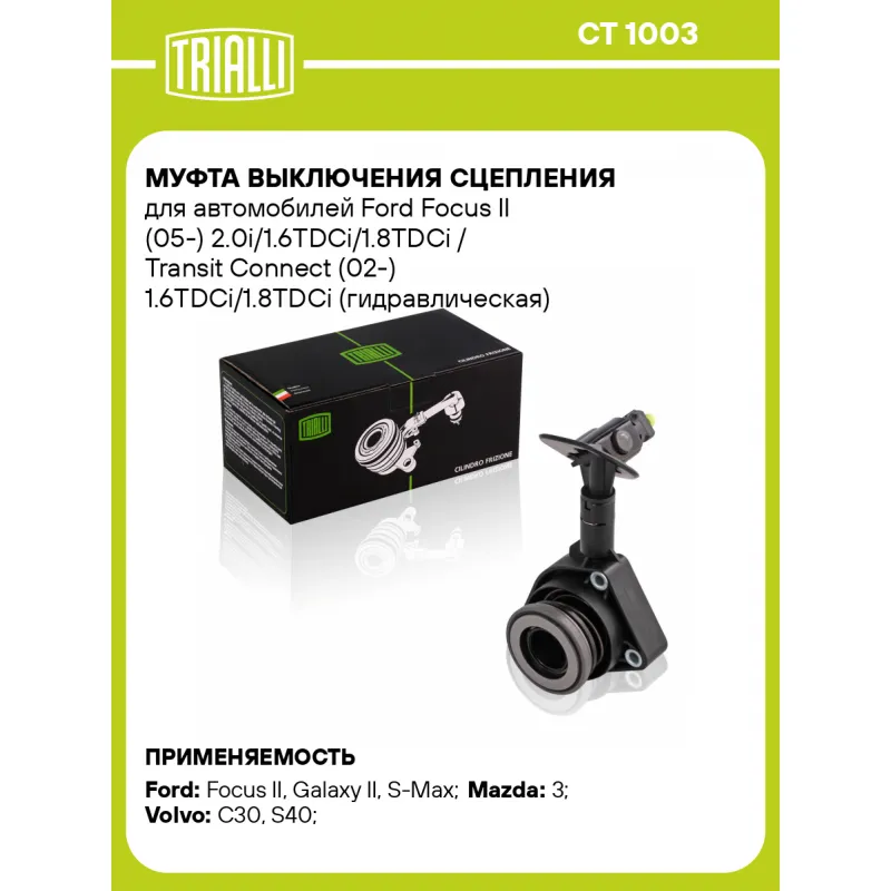 Муфта выключения сцепления для автомобилей Ford Focus II (05-) 2.0i/1.6TDCi/1.8TDCi / Transit Connect (02-) 1.6TDCi/1.8TDCi (гидравлическая) (со штуцером прокачки) Характеристики: Артикул: CT 1003 OEM номера: 2T14-7C623-DA, 2T14-7C623-BA, 1901241, 3M51-7A564-BF, 1472108, 1901244, 3M51-7A564-BE, 1226832, 2T14-7C623-AA, 3M51-7A564-BG, 1901246, 2T14-7C623-FA, 1811307, 1232035, 1811306, 2T14-7C623-GA, 1352356, 3M51-7A564-BH, 3M51-7A564BD, 1590999, 3M51-7A564-BC, 1418659, JC01-16-530D, JC01-16-530B, JC01-16-530A, JC01-16-530C, JC01-16-530, 30787871, 30735518, 8689498, 31272725, 30759458 Тип привода: гидравлический Гарантийный срок: 1 год/30 000 км Количество на автомобиль: 1 Сопутствующий товар: Комплекты сцепления: FR 1025, FR 1017, FR 1010 Товарная линейка: BLACK Подходит для авто: Ford Focus II (05-), Galaxy II (06-), S-Max (06-), Galaxy II (06-), Galaxy II (06-), S-Max (06-), Transit Connect (02-) Mazda 3 (09-), 3 (03-) Volvo C30 (06-), C30 (06-), S40 (04-) Для проверки применяемости отправьте VIN автомобиля через вкладку "Есть вопросы о товаре?" Комплектация: Муфта выключения сцепления в сборе (гидравлическая) - 1 шт Гарантия: от 1 года.
