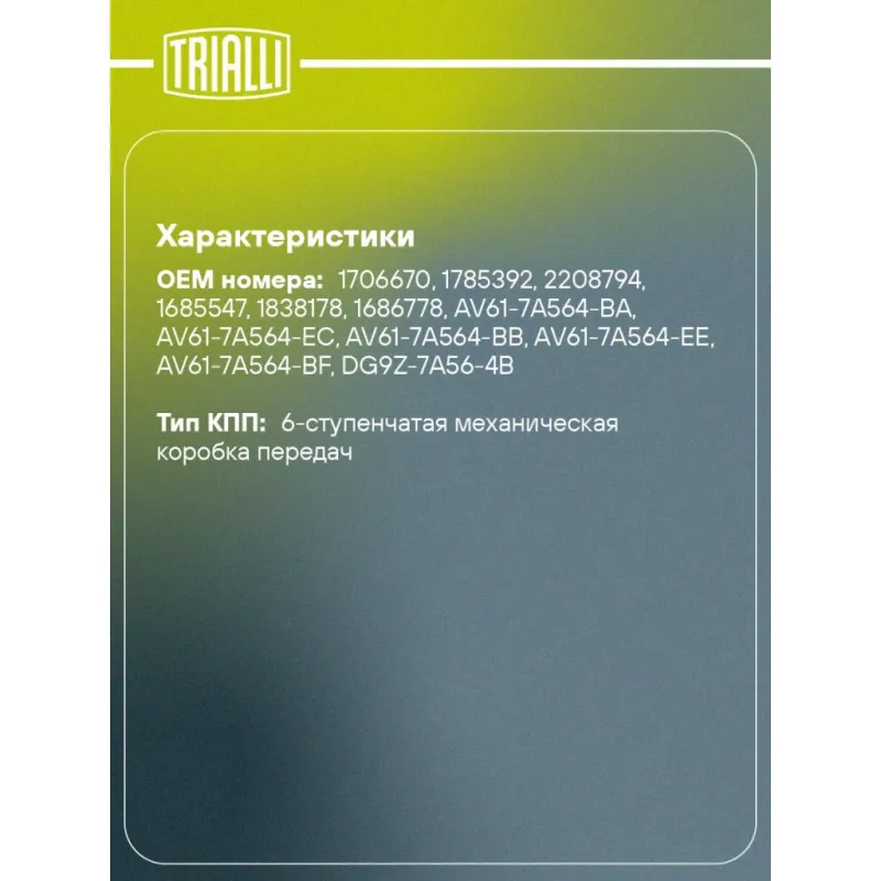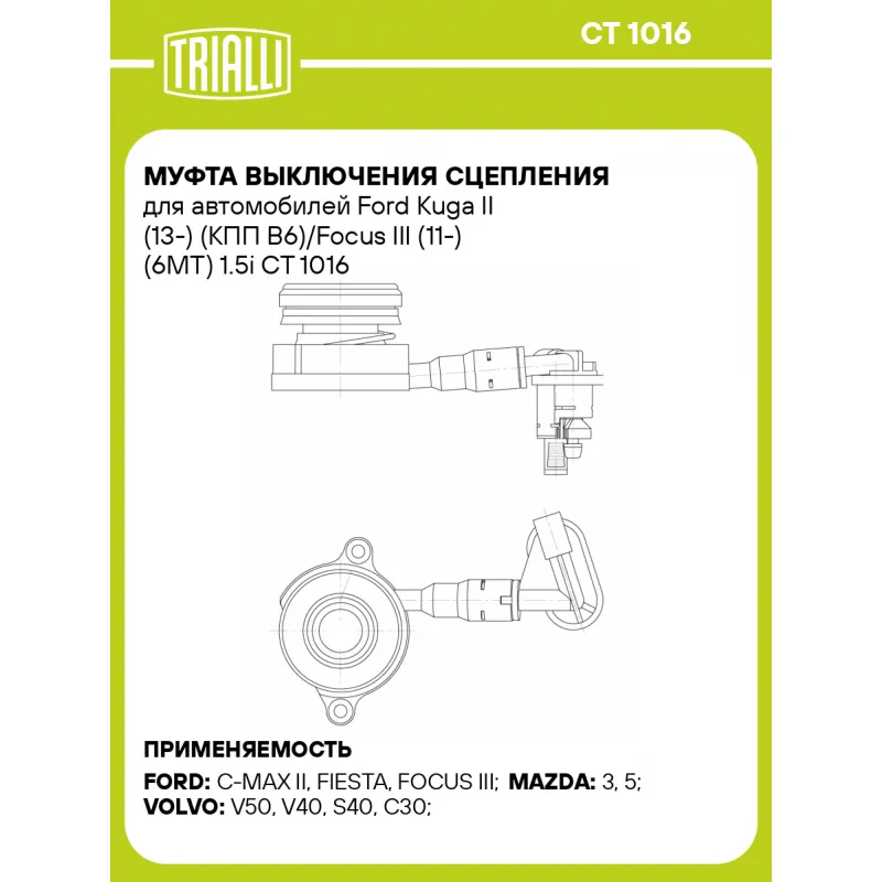 Муфта выключения сцепления для автомобилей Ford Kuga II (13-) (КПП B6)/Focus III (11-) (6MT) 1.5i Характеристики: Артикул: CT 1016 OEM номера: 1706670, 1785392, 2208794, 1685547, 1838178, 1686778, AV61-7A564-BA, AV61-7A564-EC, AV61-7A564-BB, AV61-7A564-EE, AV61-7A564-BF, DG9Z-7A56-4B, AV61-7A564-BD, AV61-7A564-EB, AV61-7A564-BFS, AV61-7A564-ED, AV61-7A564-BC, 2144822, 2002011, 2002008, 1818044, 1760736, AV61-7A564-BE, B6Y2-16-530BAA, B6Y2-16-530B, B6Y2-16-530A, B6Y2-16-530 Гарантийный срок: 1 год/30 000 км Количество на автомобиль: 1 Сопутствующие товары:: комплекты сцеплений Тип привода: гидравлический Товарная линейка: BLACK КПП: B6 Двигатель: C15HDTX, M8DA, M8DB, 15HDTX_C Класс: Евро 5 Тип КПП: 6-ступенчатая механическая коробка передач Комплектация: Муфта выключения сцепления в сборе (гидравлическая) - 1 шт Гарантия: от 1 года.