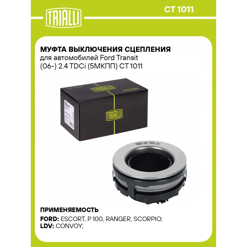 Муфта выключения сцепления для автомобилей Ford Transit (06-) 2.4 TDCi (5МКПП) Характеристики: Артикул: CT 1011 OEM номера: 4412070, 3C11-7548-AA, 6164967, ECB 135, 88BX-7548-A2A, 88BB-7548-AA Тип КПП: 5 МКПП Тип привода: механический Гарантийный срок: 1 год/30 000 км Сопутствующий товар: Муфты сцепления: FR 1003 Количество на автомобиль: 1 Сопутствующие товары:: комплекты сцеплений Сопутствующий товар: Комплекты сцепления: FR 1003 Товарная линейка: BLACK КПП: MT75 Комплектация: Муфта выключения сцепления в сборе - 1 шт Гарантия: от 1 года.