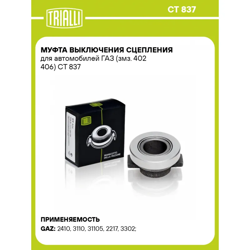 Муфта выключения сцепления для автомобилей ГАЗ (змз. 402 406) Характеристики: Артикул: CT 837 OEM номера: 24-1601180-02, 3110-1601180, 24-1601180-02-99, 2410-1601180-02, 24-1601180 Тип привода: механический Гарантийный срок: 1 год/30 000 км Количество на автомобиль: 1 Особенности конструкции:: чугун Сопутствующий товар: Комплекты сцепления: FR 797 Товарная линейка: BLACK Тип двигателя: змз. 402, 406 Подходит для авто: ГАЗ 2410, 2410, 3110, 31105, 2217, 2217, 2217, 3302, 3302, 3302, Gazelle, 2410, 3110, 3110, 3110, 3110, 31105, 31105, 31105, 31105, 2217, 2217, 3302, 3302 Для проверки применяемости отправьте VIN автомобиля через вкладку "Есть вопросы о товаре?" Комплектация: Муфта выключения сцепления в сборе - 1 шт Гарантия: от 1 года.